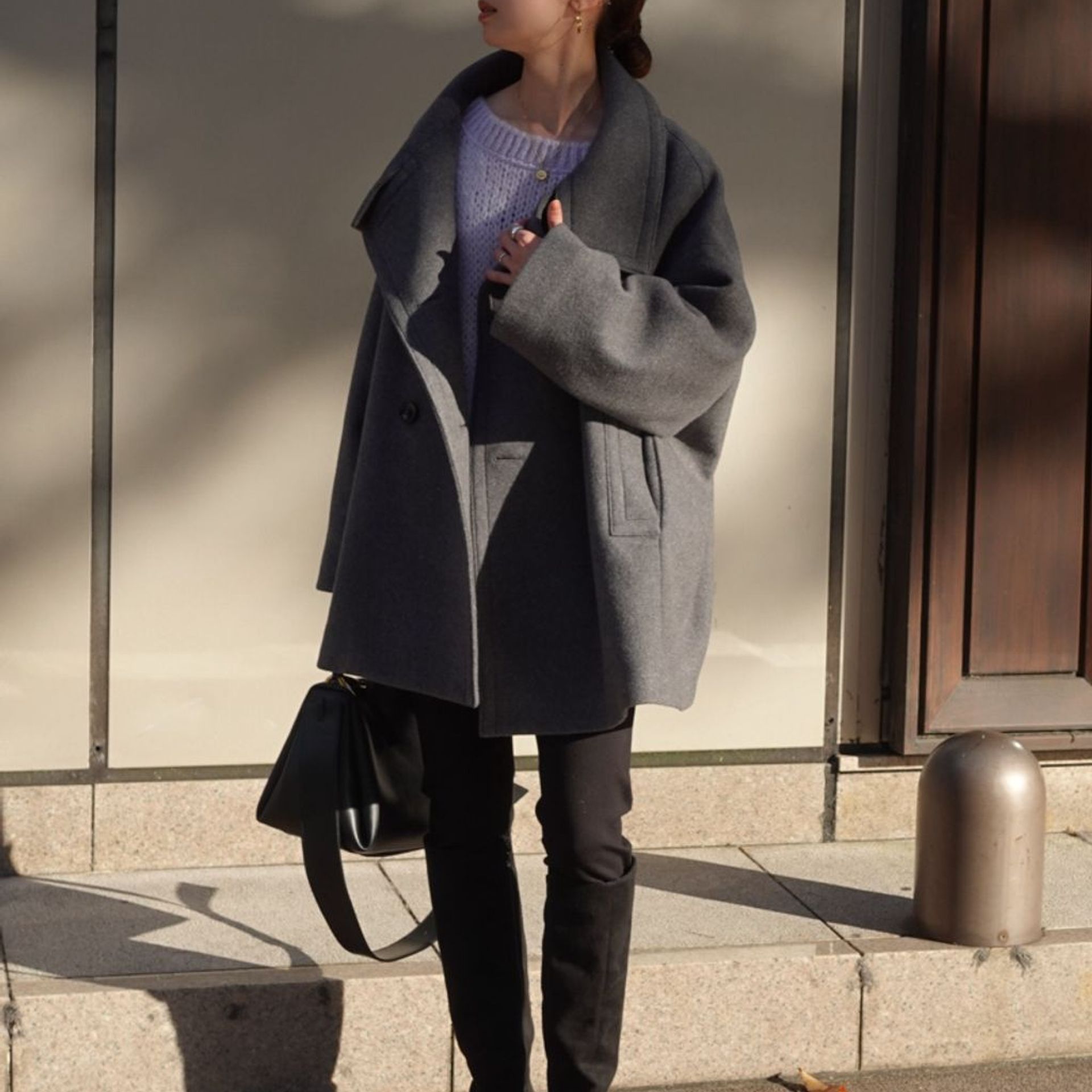 全体がダークトーンなので、コートを明るいカラーにして軽さを出したのがGOOD!