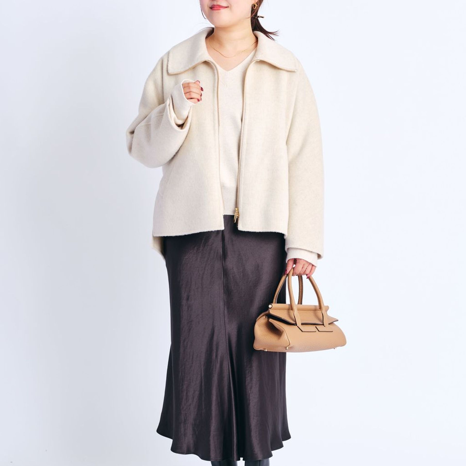 ゴールドジップと合わせたキャメルバッグも良いアクセントに。
