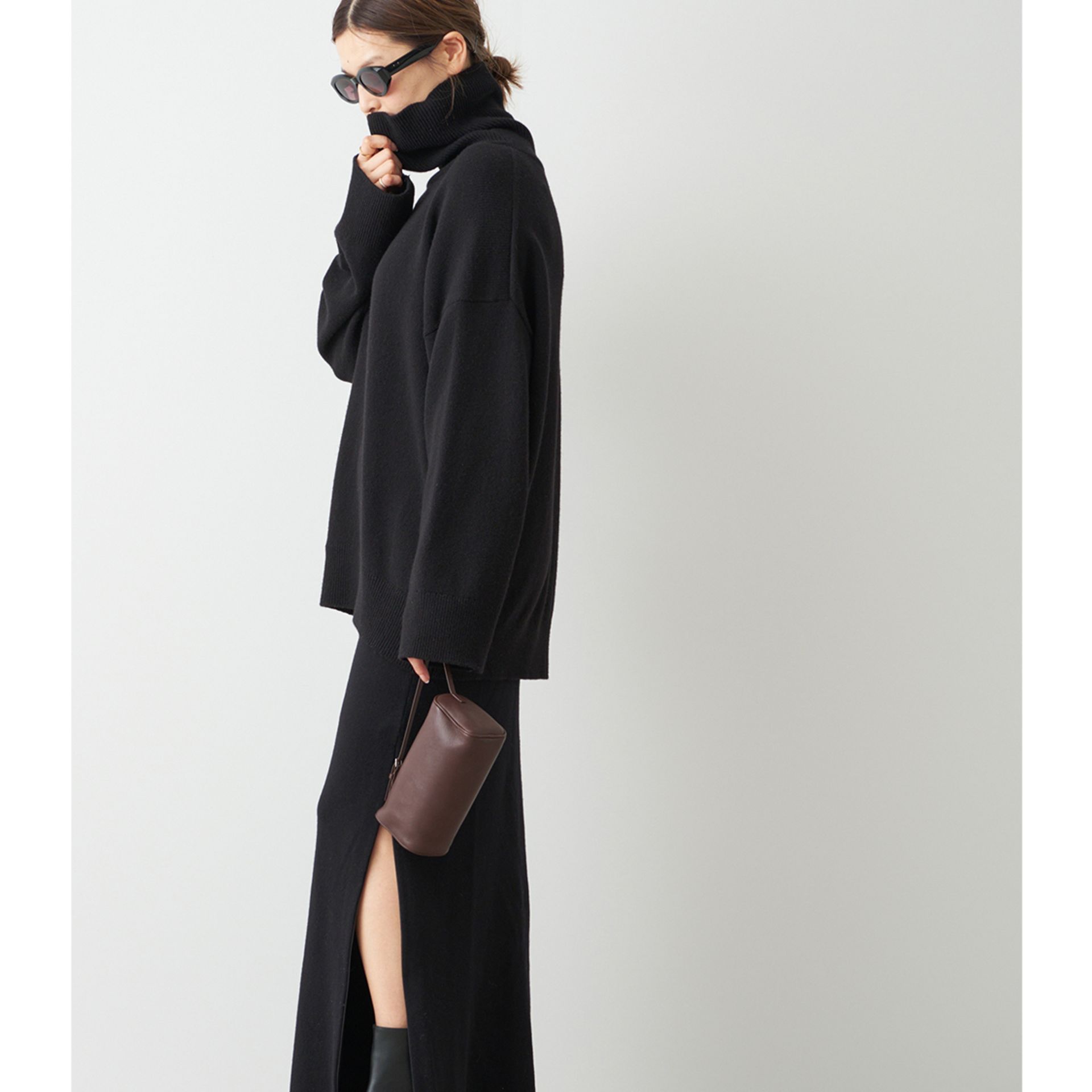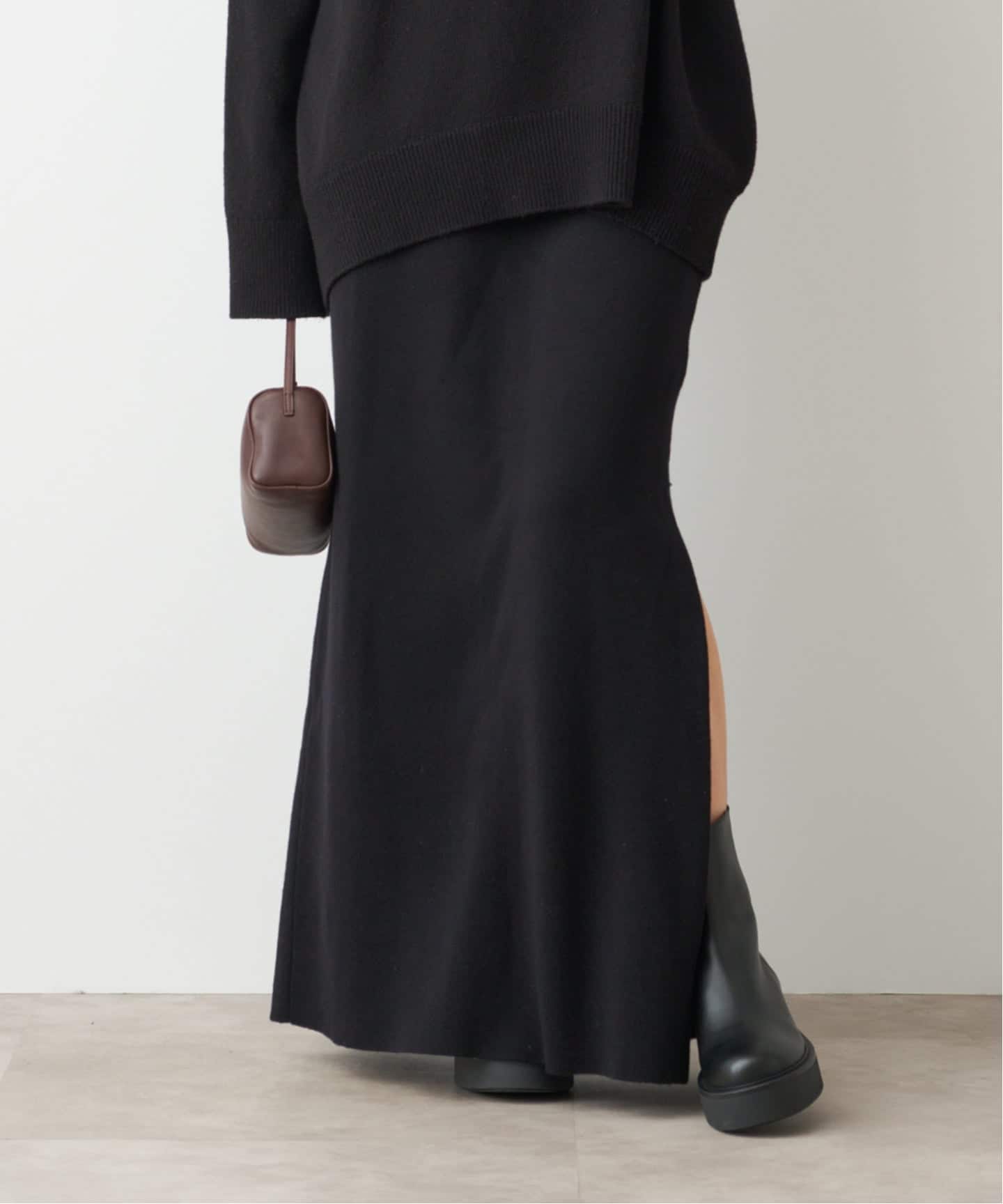 ニットスカートのニュアンス感に潔いスリットでモダンなスタイルに仕上げてくれる。
