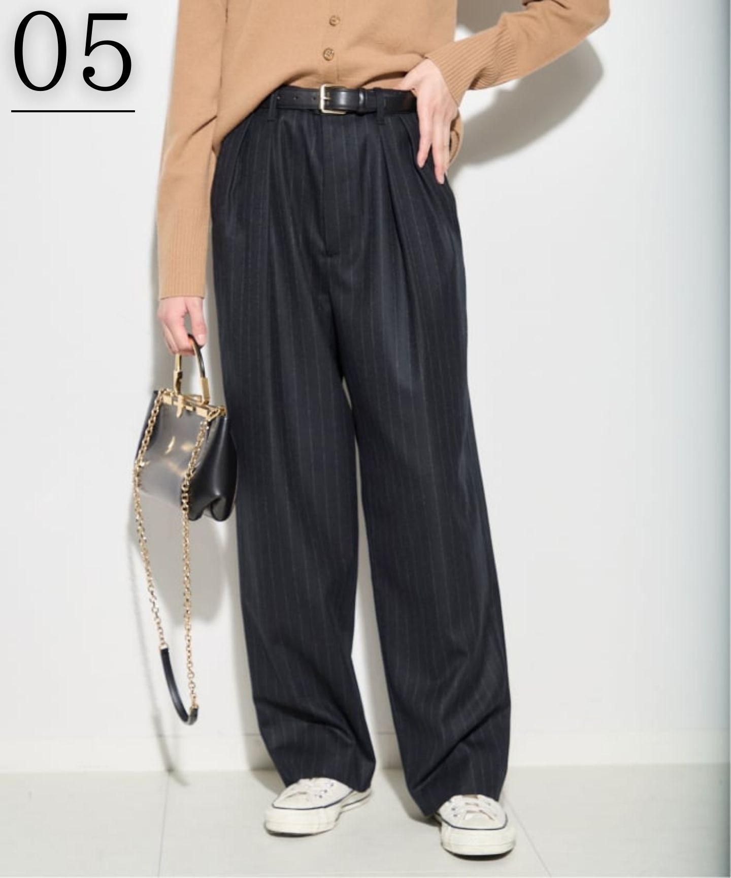 きれいめな大人っぽい雰囲気ながらシャツやスウェットなどリラックスカジュアルなスタイリングにもマッチするので幅広いスタイリングがお楽しみ頂けます。