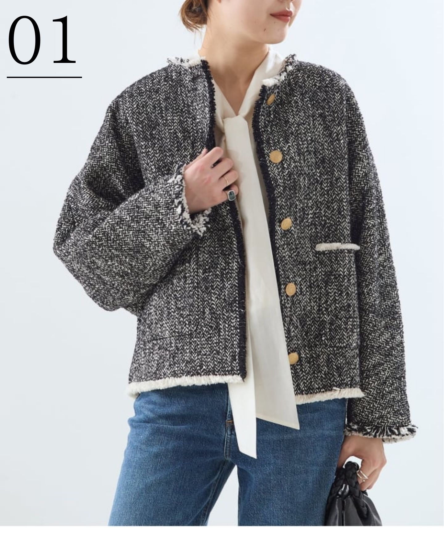 イタリアのGIOLICA社の生地を使用したツイードジャケット。肩がおちたゆったりとしたシルエットで、コンサバにならないようなサイズ感になっています。着丈は少し短めに設定し、きちんと感もあるデザインに。袖のボリューム感もポイントです。小柄な方もバランスよく着ていただけます◎ONOFFどちらにも活用でき、重宝するアイテムです◎
