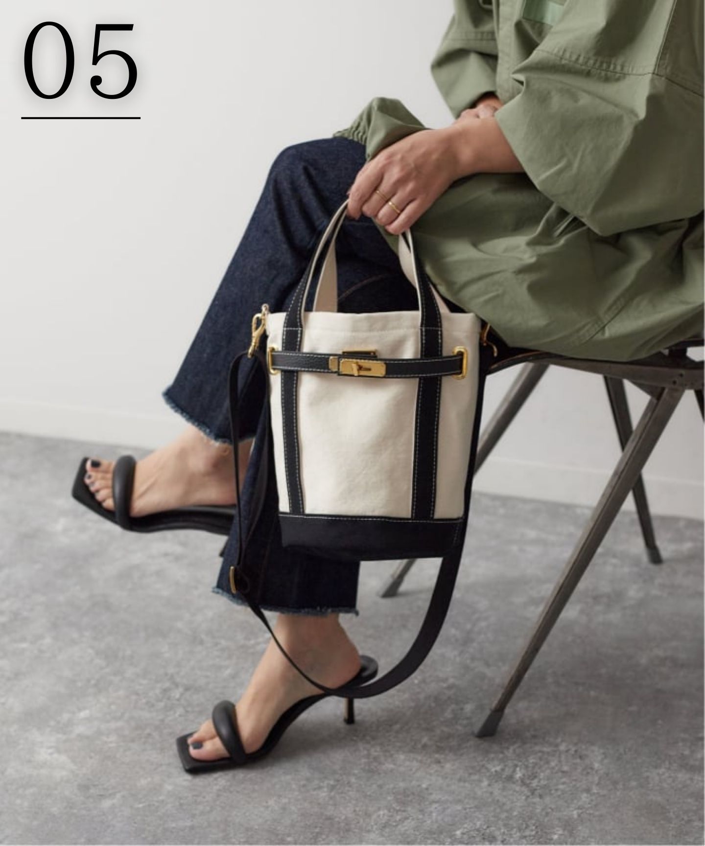 L'ESSAGEの完全別注のバケツトートバッグ。SITA PARANTICAの特徴的なゴールドの金具を使用し、大人の女性が持てるカジュアルバッグに仕上げました。ショルダーストラップ付で、今回あえてストラップベルトを少し太くすることで寄りカジュアルな雰囲気に。2WAYでの利用が可能です。