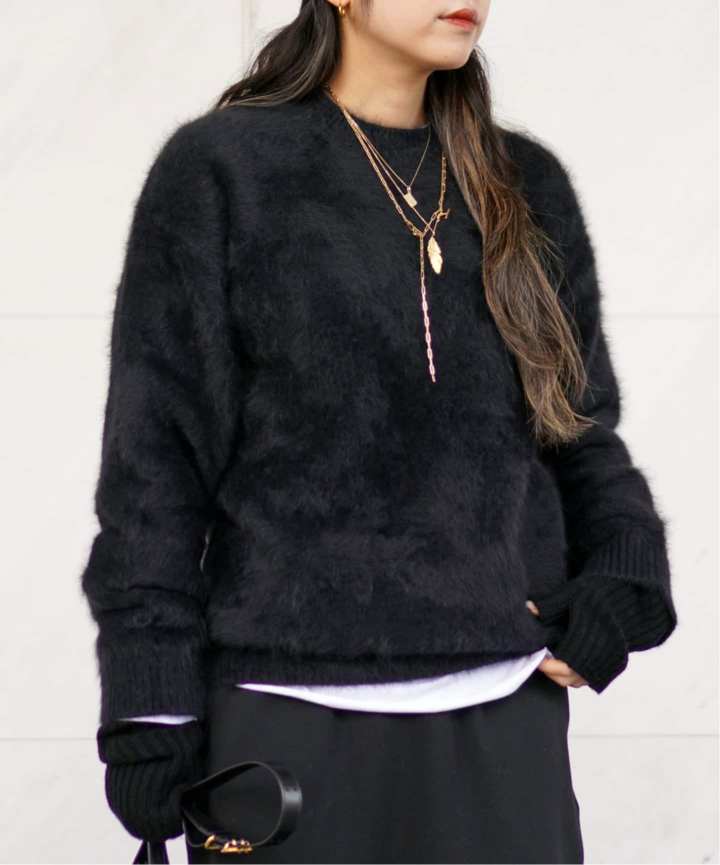 メンズライクが好きですが、冬のふわふわニットには目がないのでDUETクルーネックセーターを主役に、メンズライクにスタイリング。