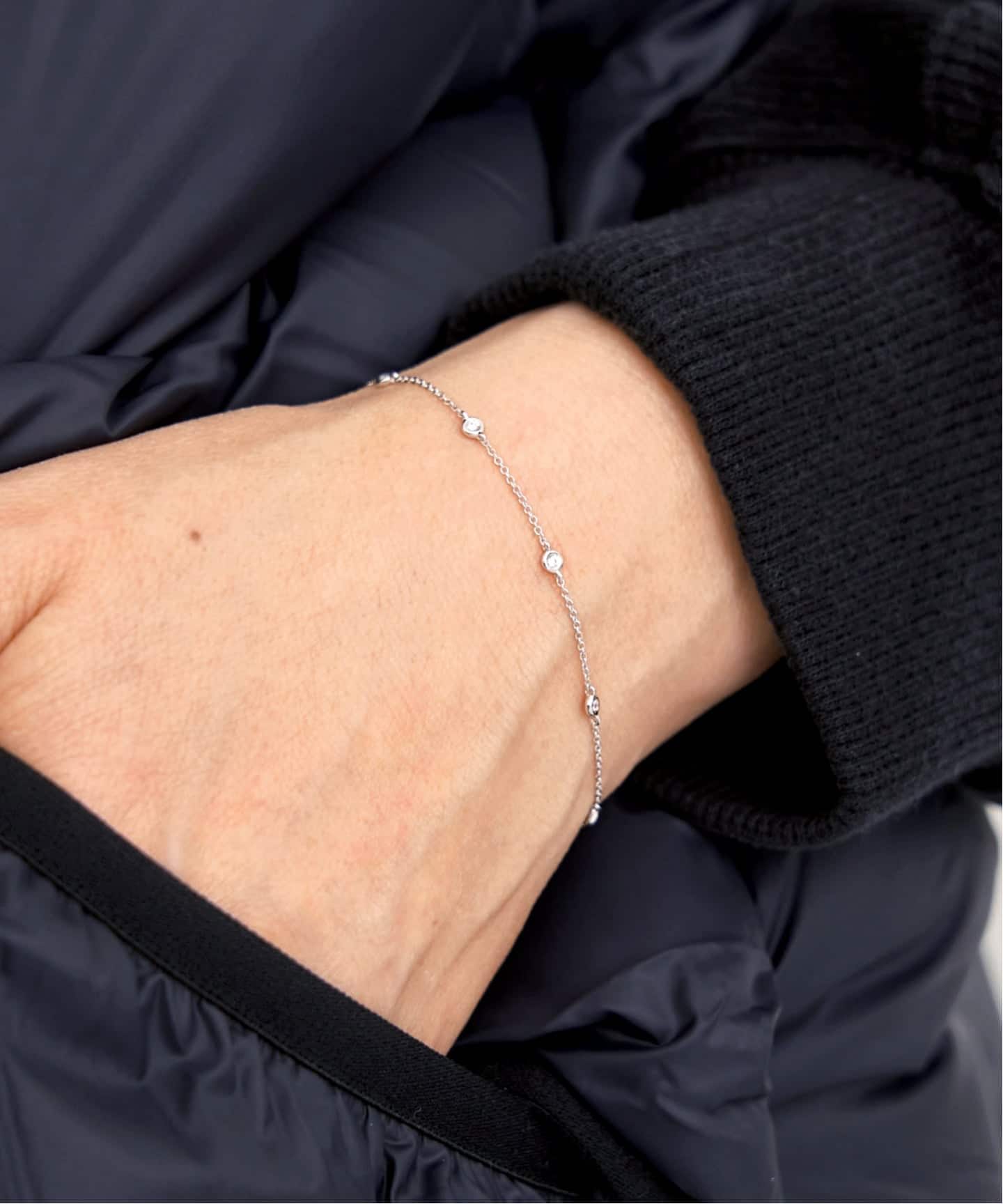ホワイトゴールドを使用したブレスレットはシルバー派にもおすすめ。時計やカフと重ね付けもしやすいシンプルなモチーフはついつい毎日手に取りたくなるデザイン。