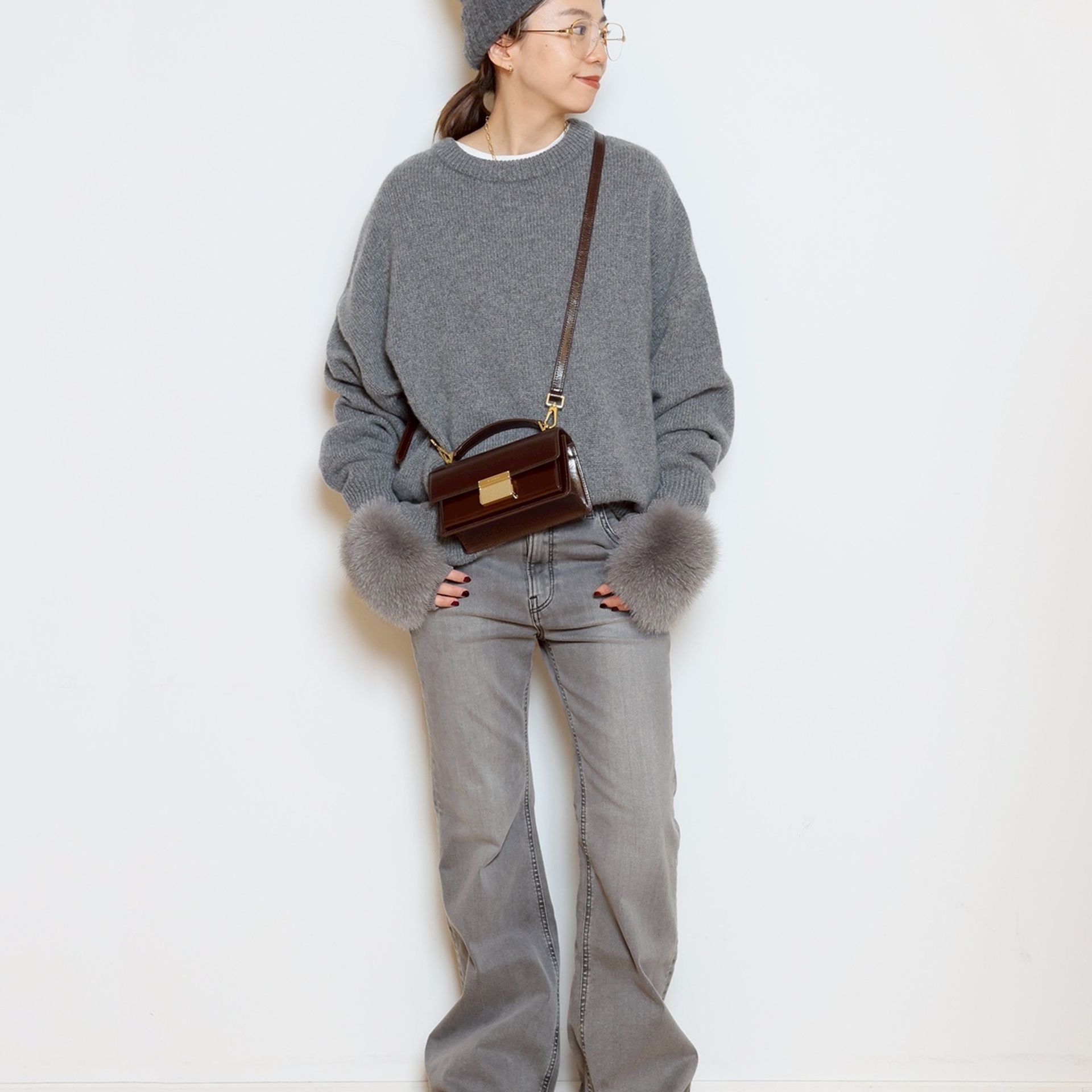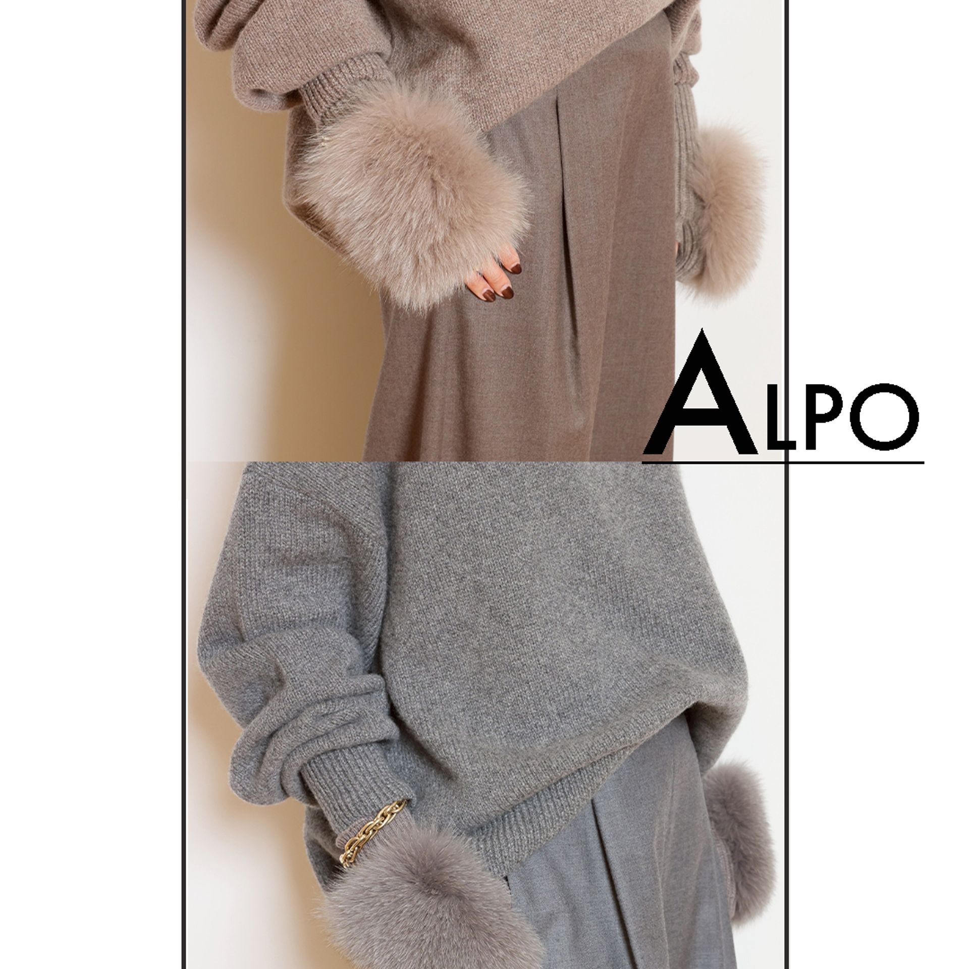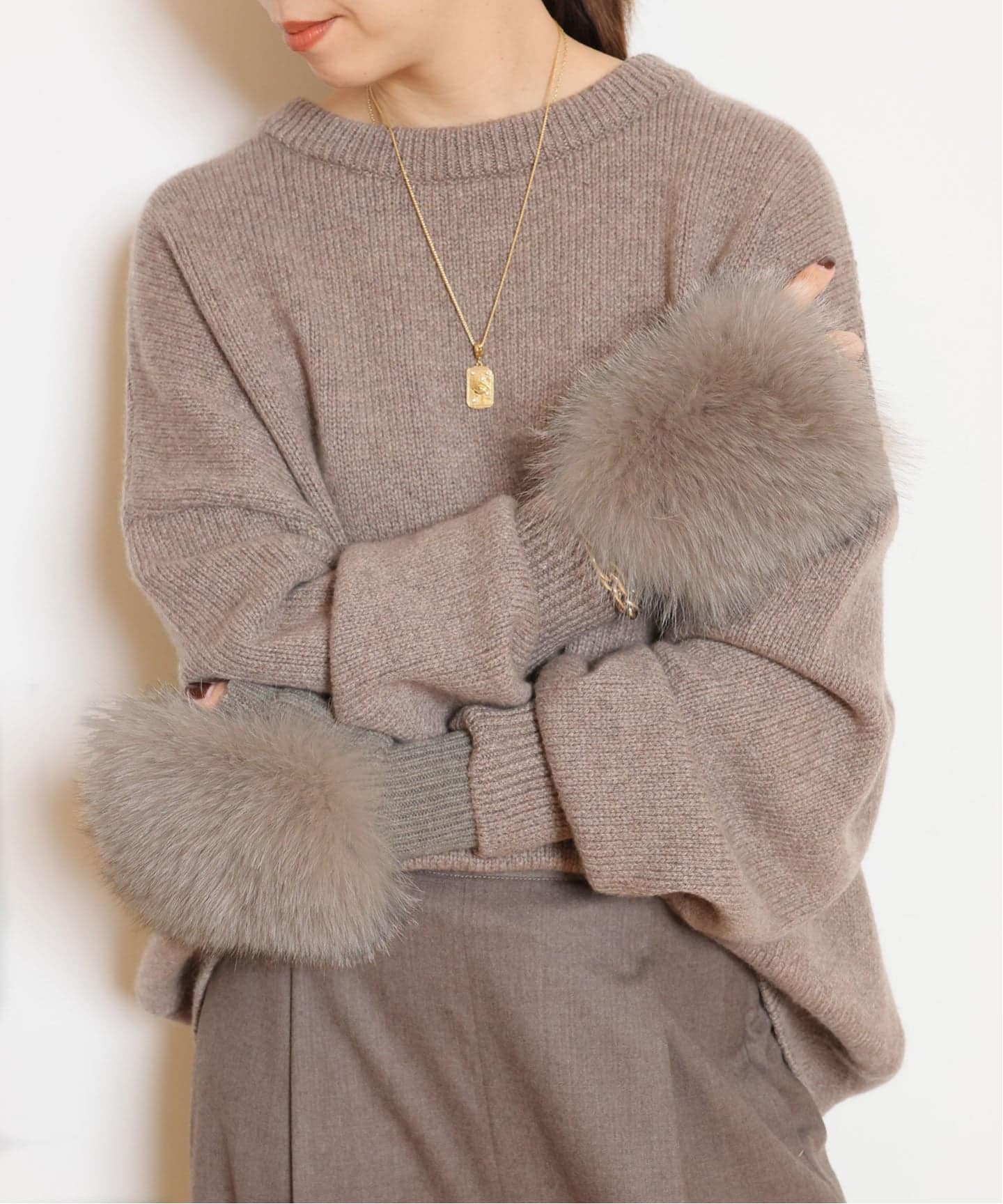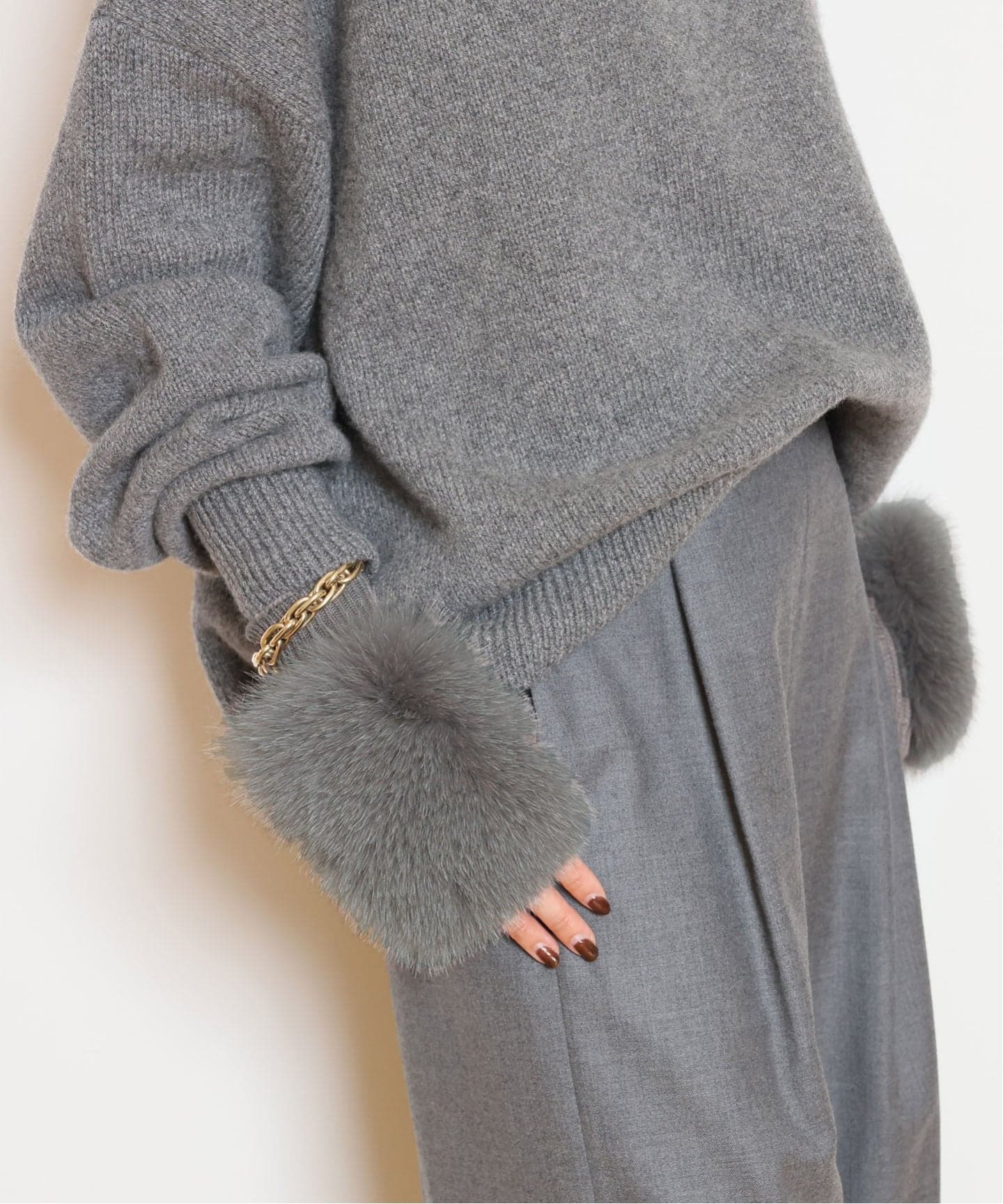 フォックスファーの華やぎが引き立つ ALPO のアームウォーマー。カシミア混ならではの柔らかな温もりで、冬の手元をエレガントに。