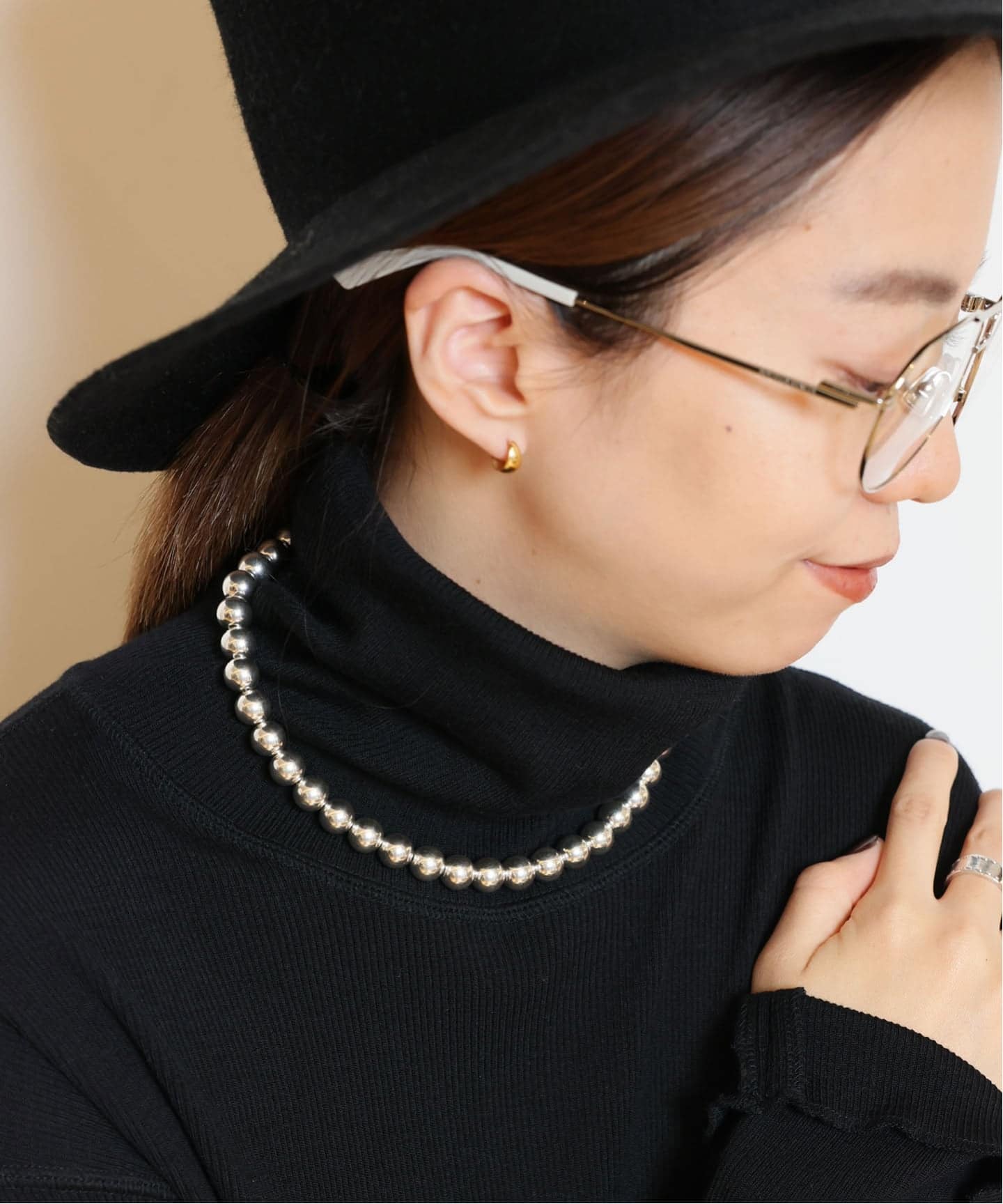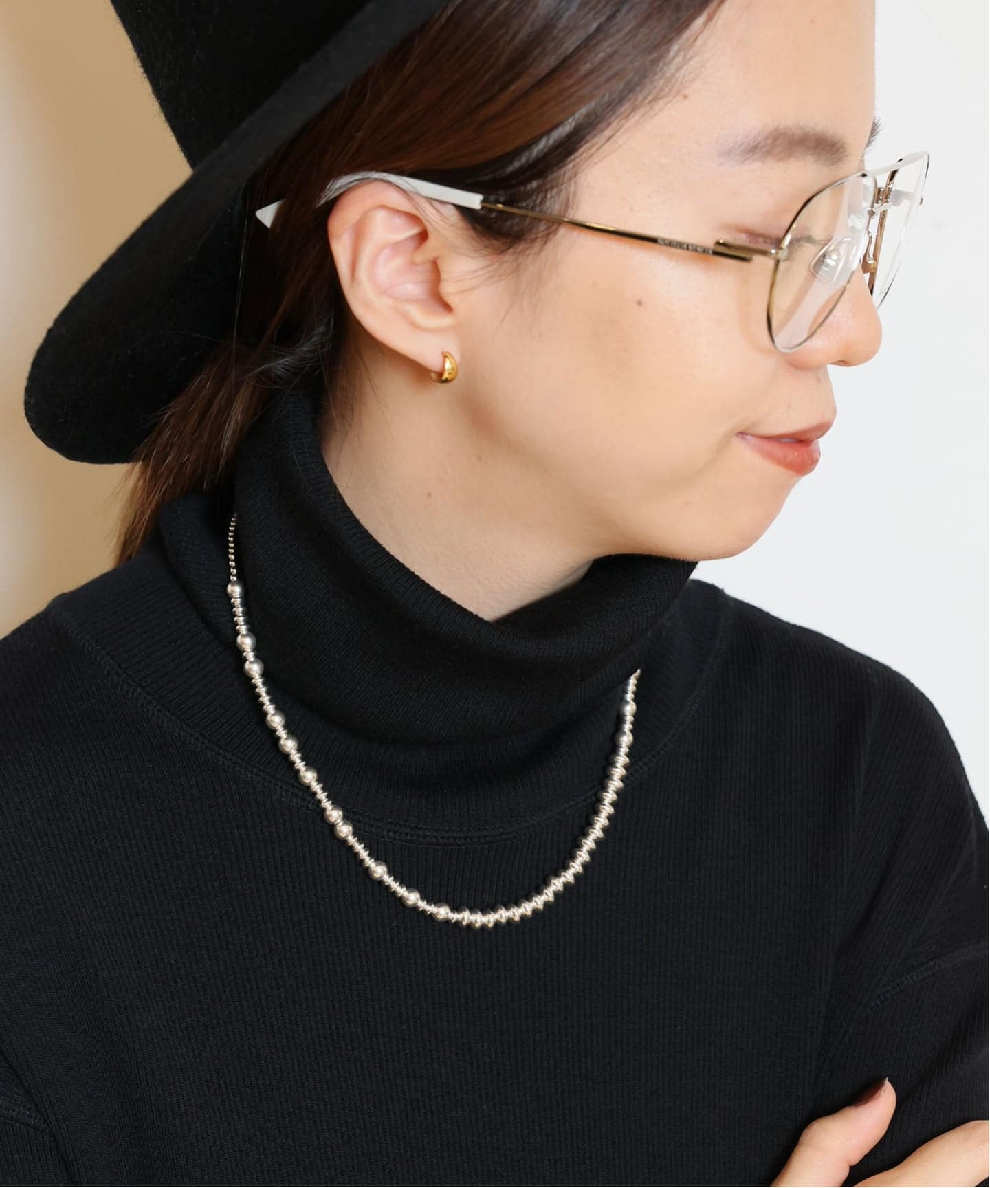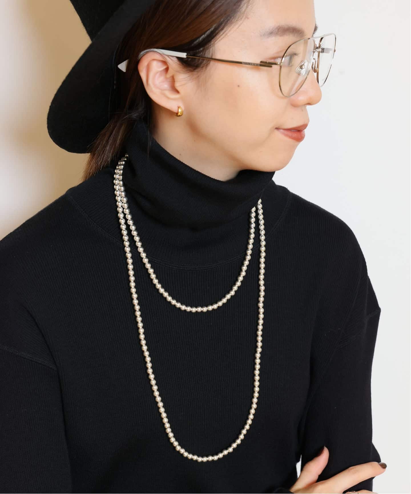 まるでパールのように艶めく HARPO のシルバーパールを重ねて、顔まわりも華やかに。