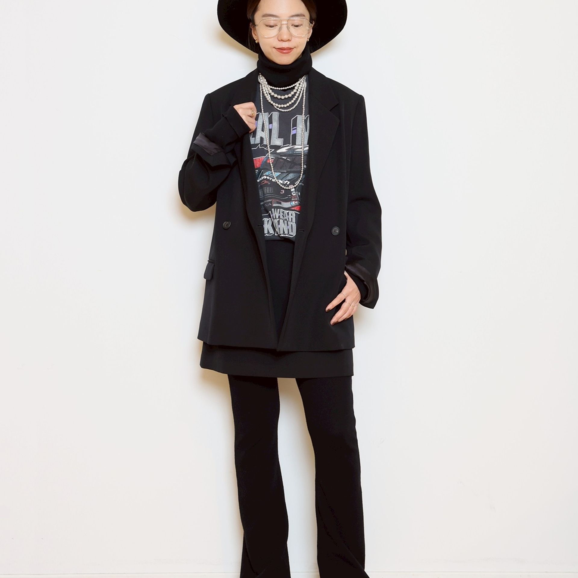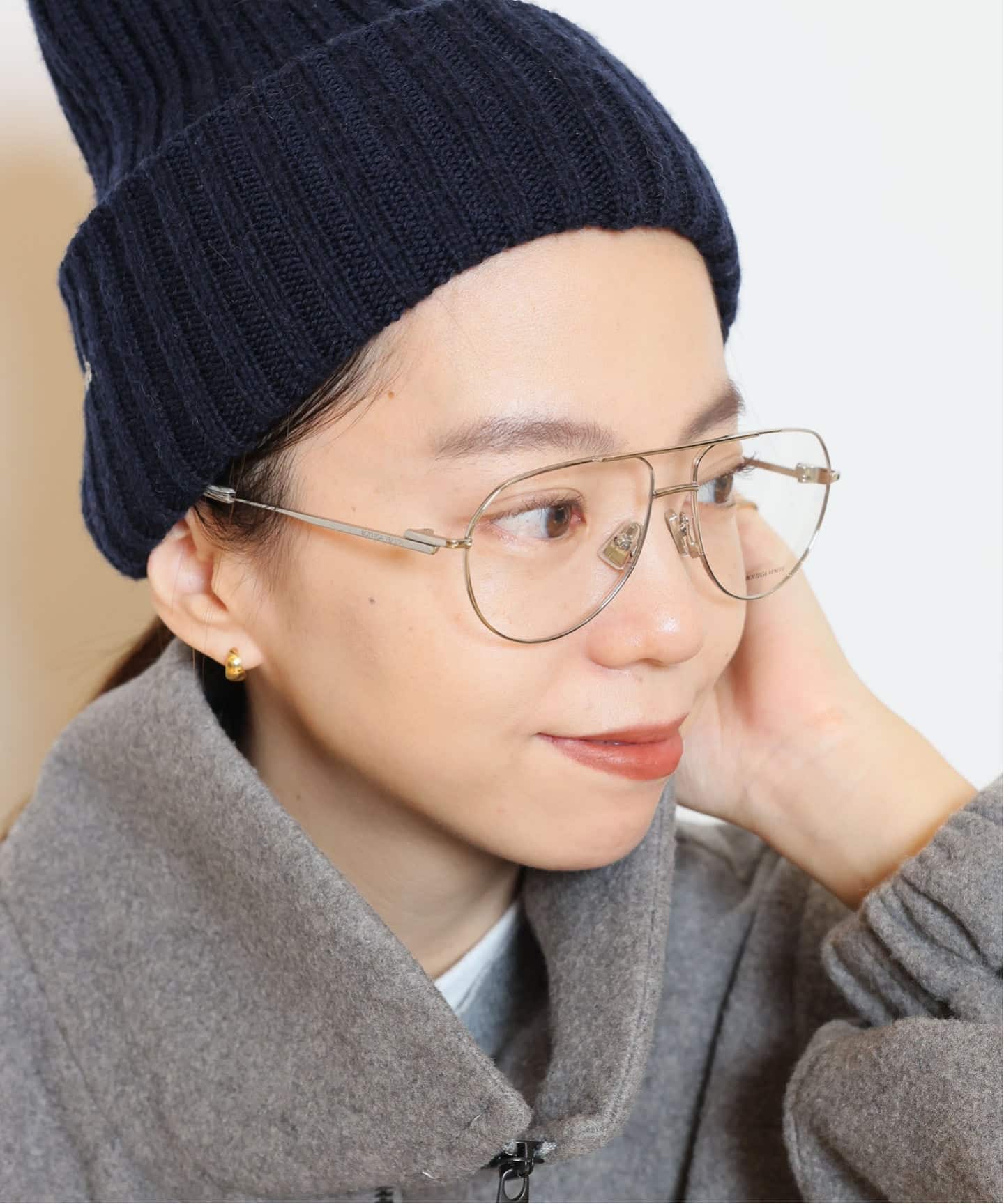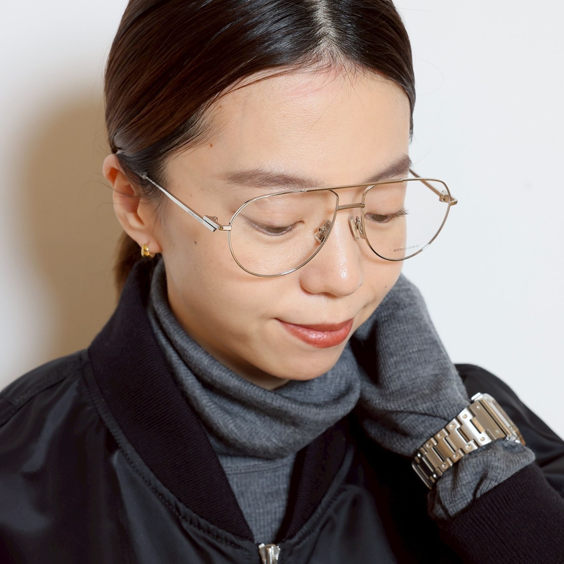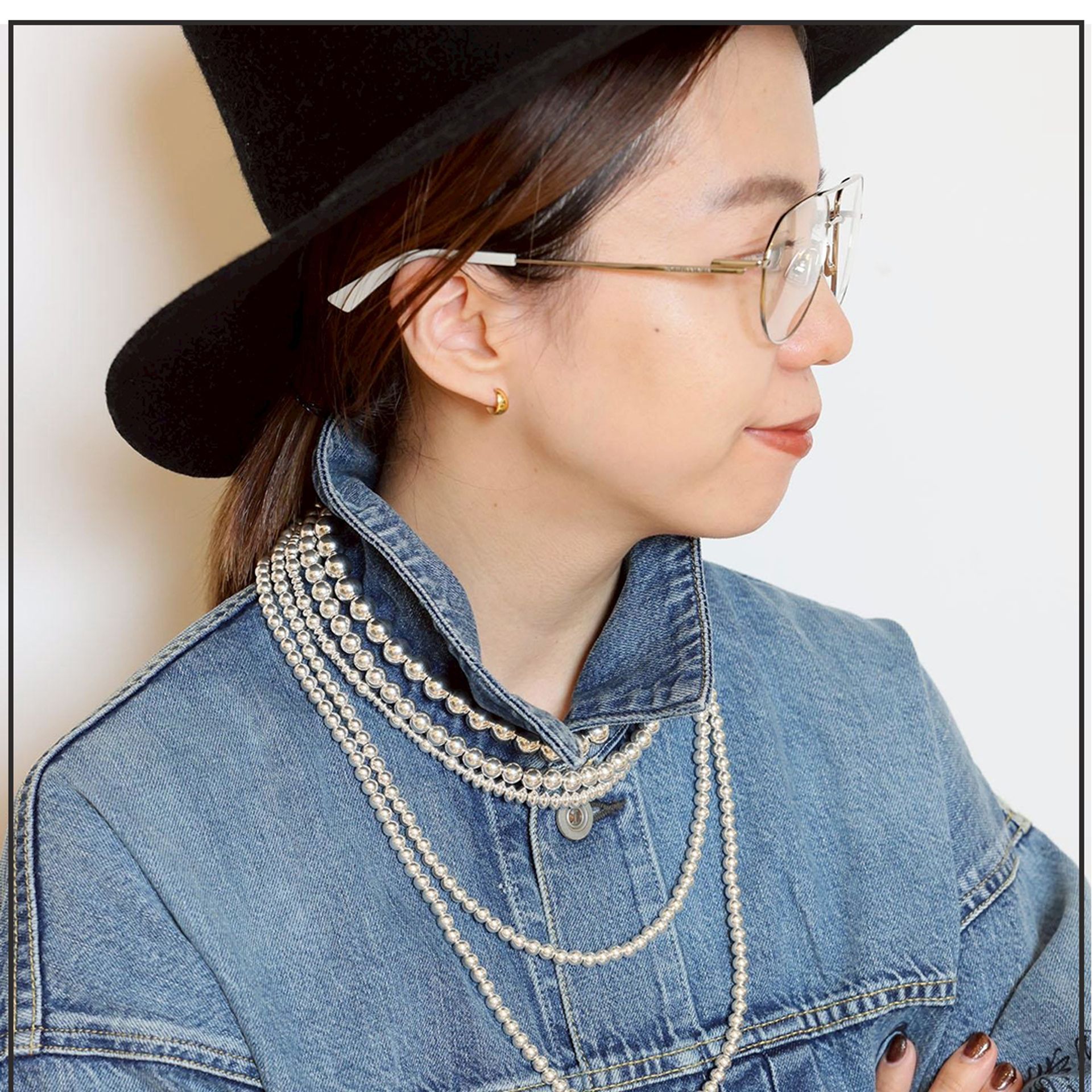 まるでパールのように艶めく HARPO のシルバーパールを重ねて、顔まわりも華やかに。