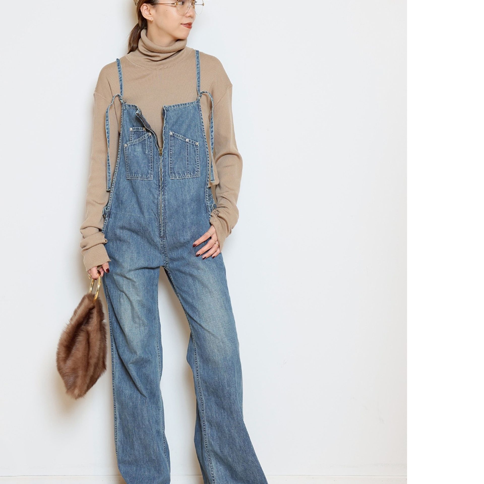 華奢なストラップが、カジュアルなオーバーオールに女性らしいニュアンスをプラス。