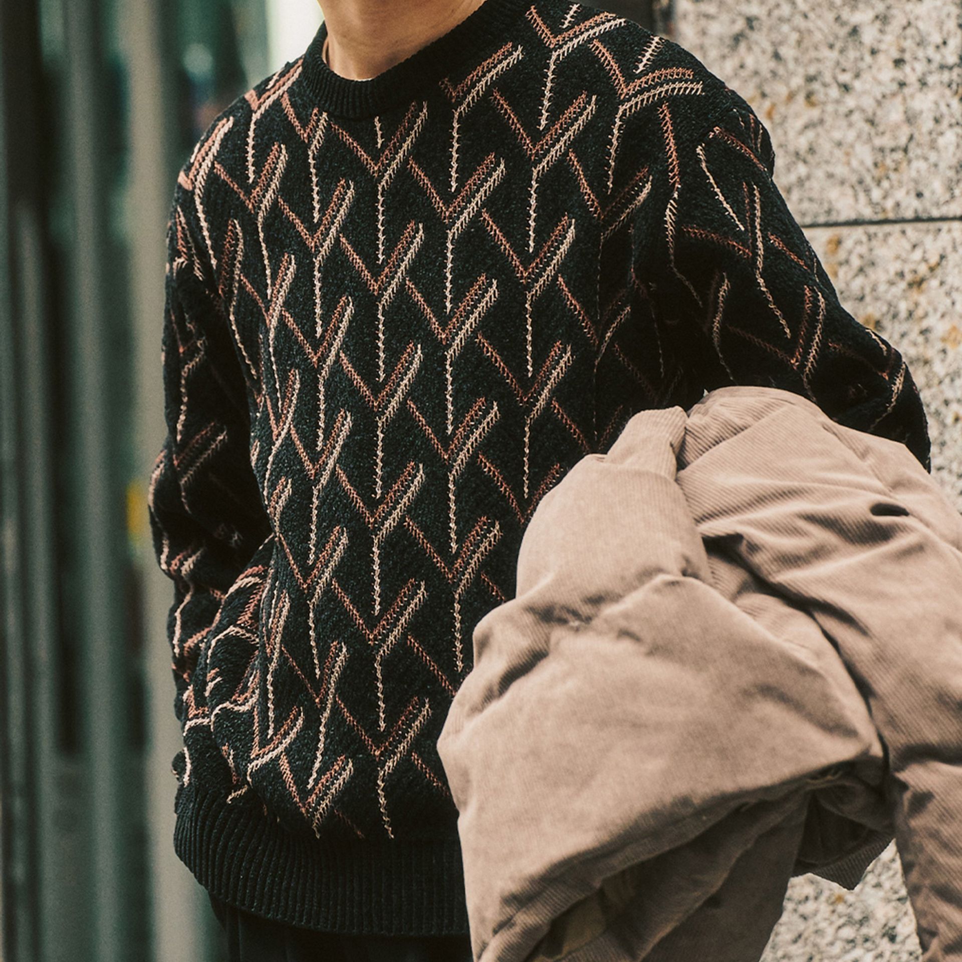 大胆なジオメトリック柄を上品に仕立てた、冬コーデの主役になる存在感あるジャガードニット。
