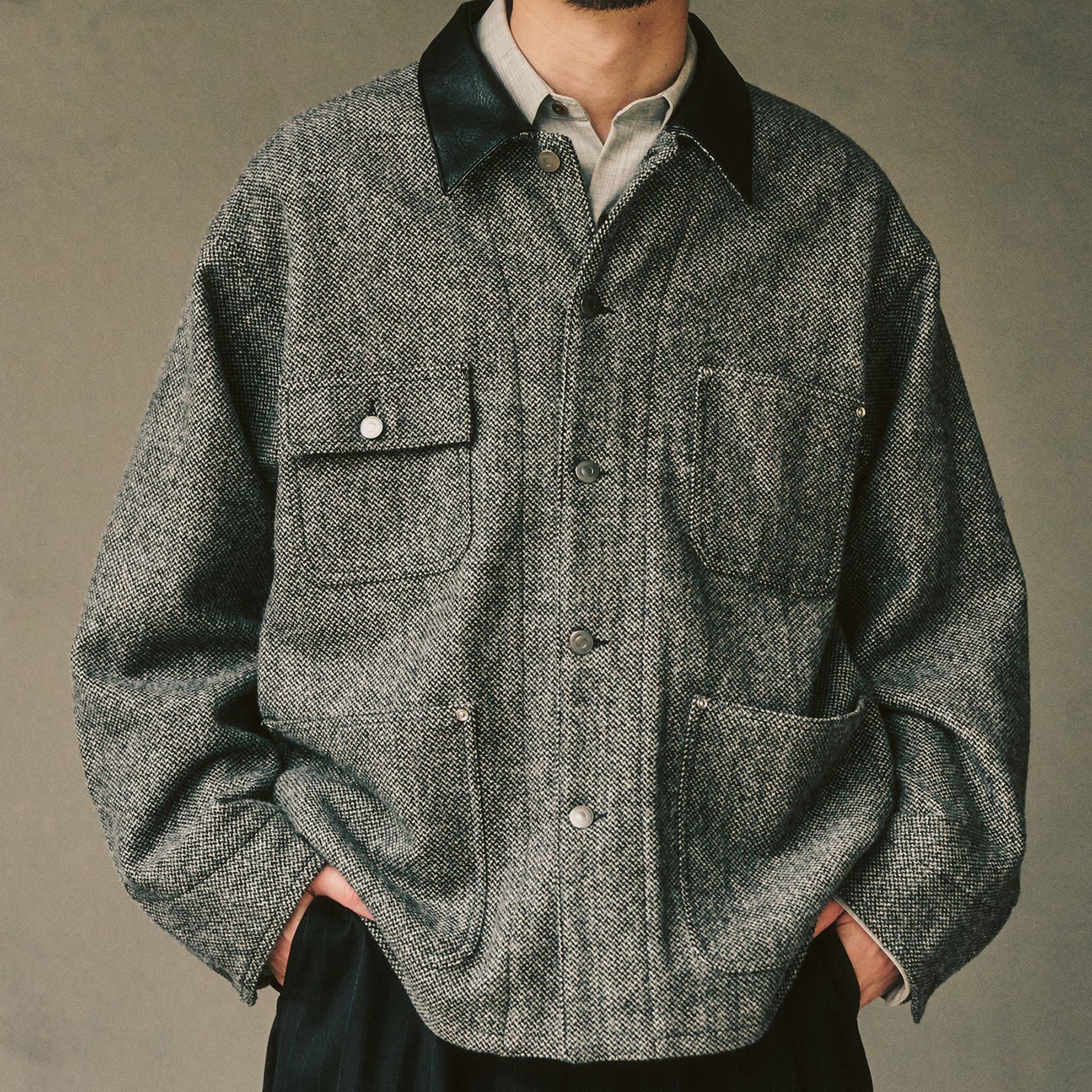 クラシックな表情と程よい武骨さで、“大人の冬羽織り”を格上げするツイードアウター。中にニットやパーカーを着込んだスタイルもおすすめです◎