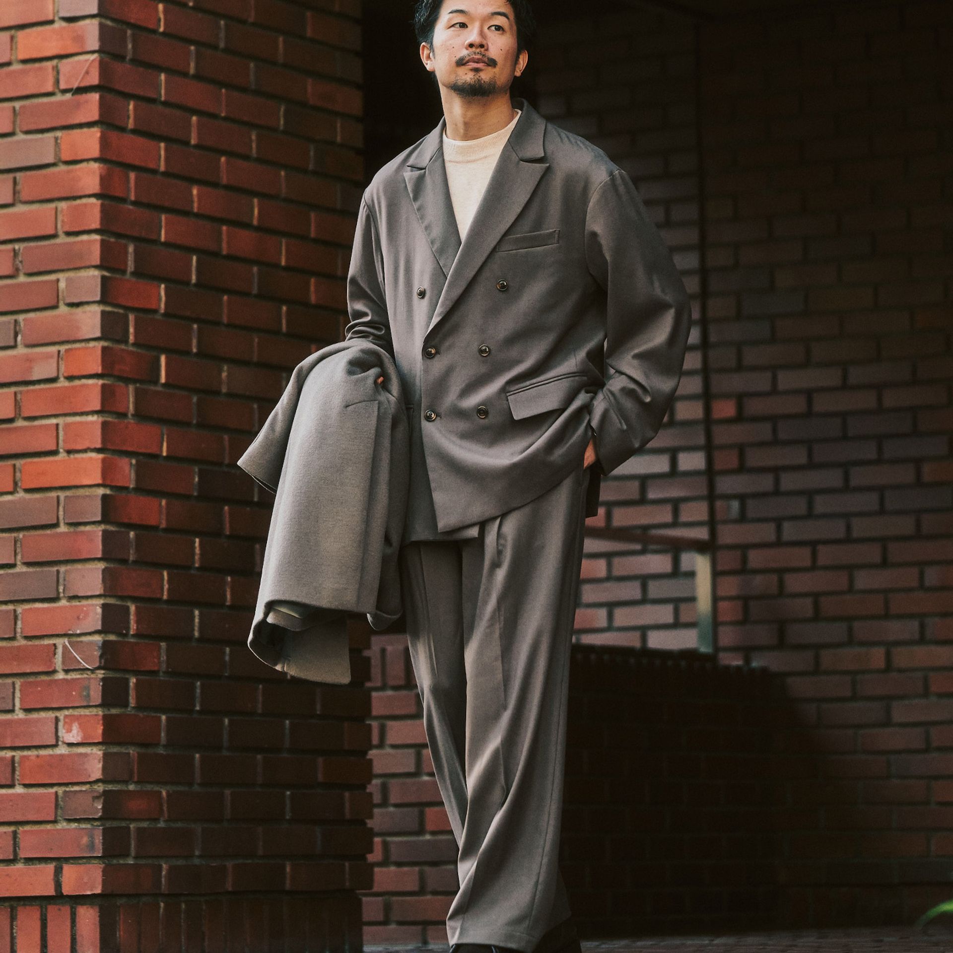 ゆったりとしたシルエットと端正な表情が共存した、冬の“品よくラク”を叶えるセットアップ。一着持っておくと何かと安心!