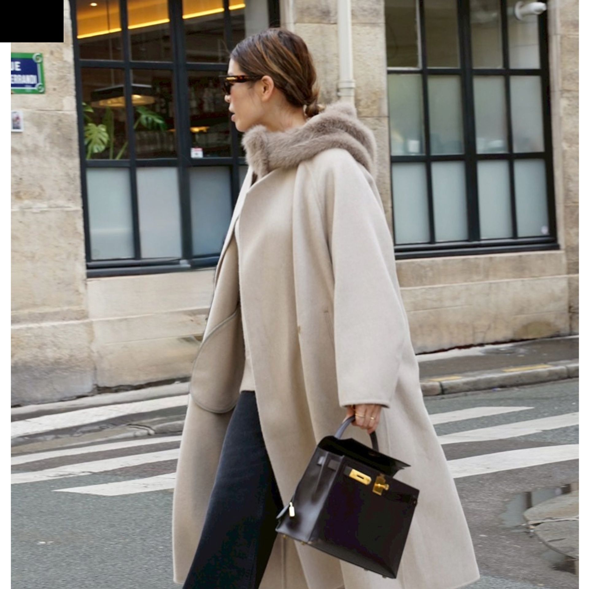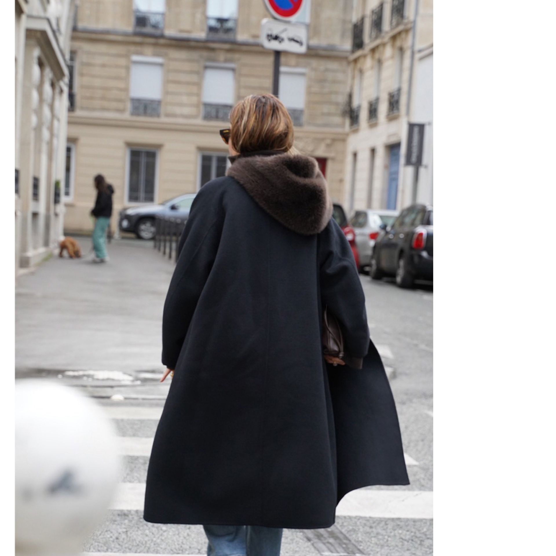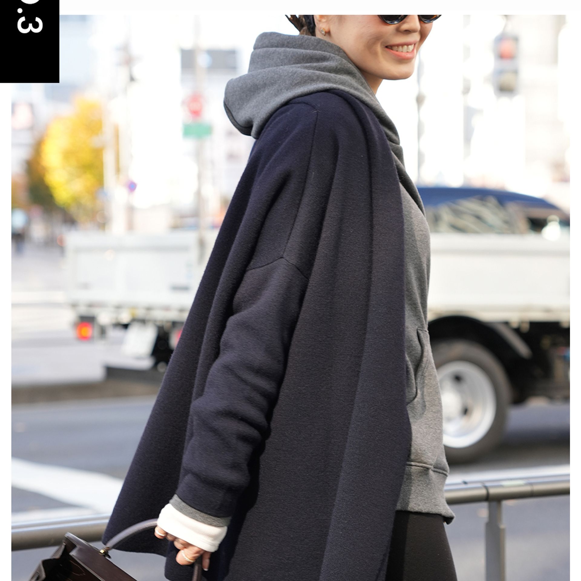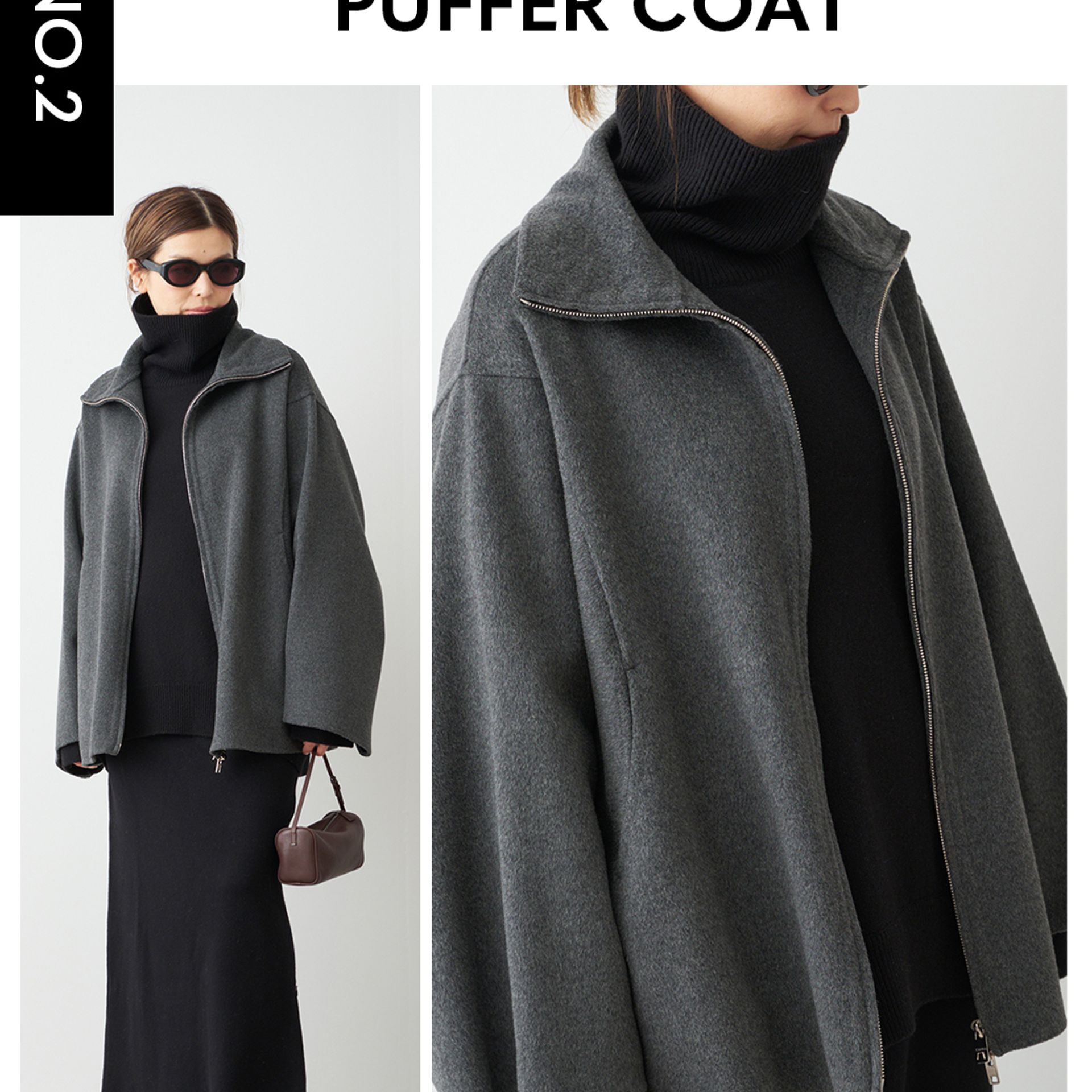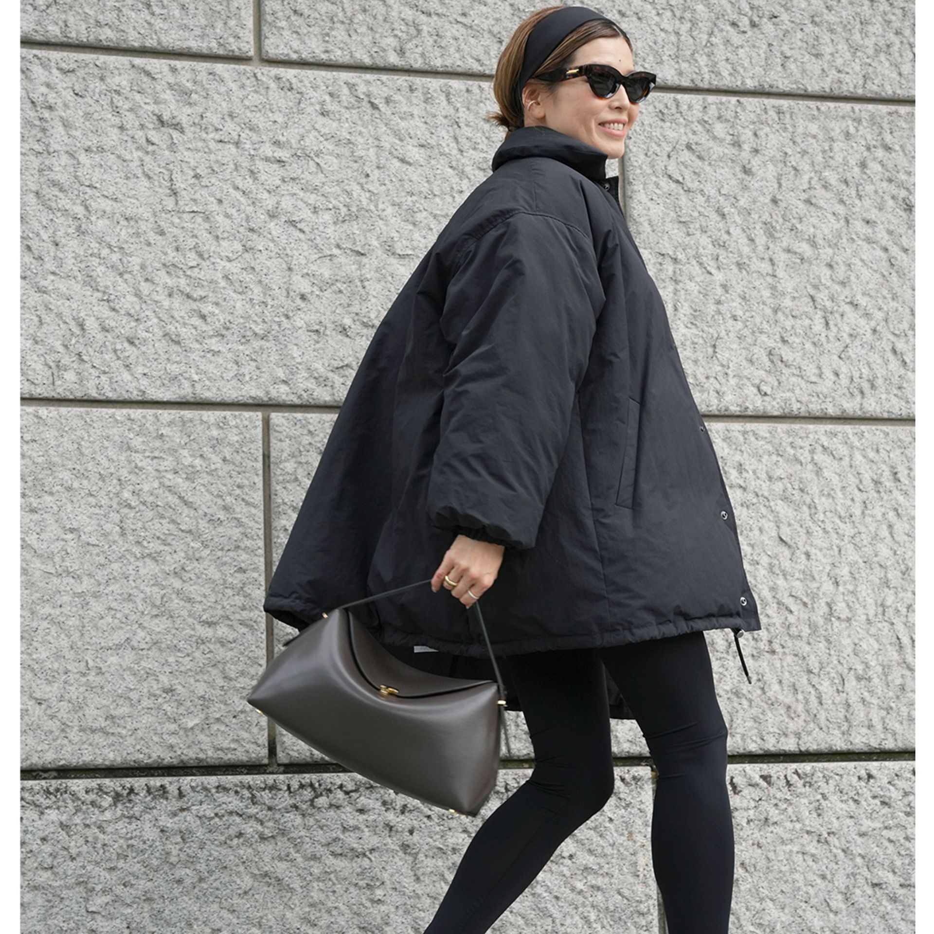 たっぷりサイズにミドルの丈バランス、構築的なシルエットがどの角度からも雰囲気を放つ。