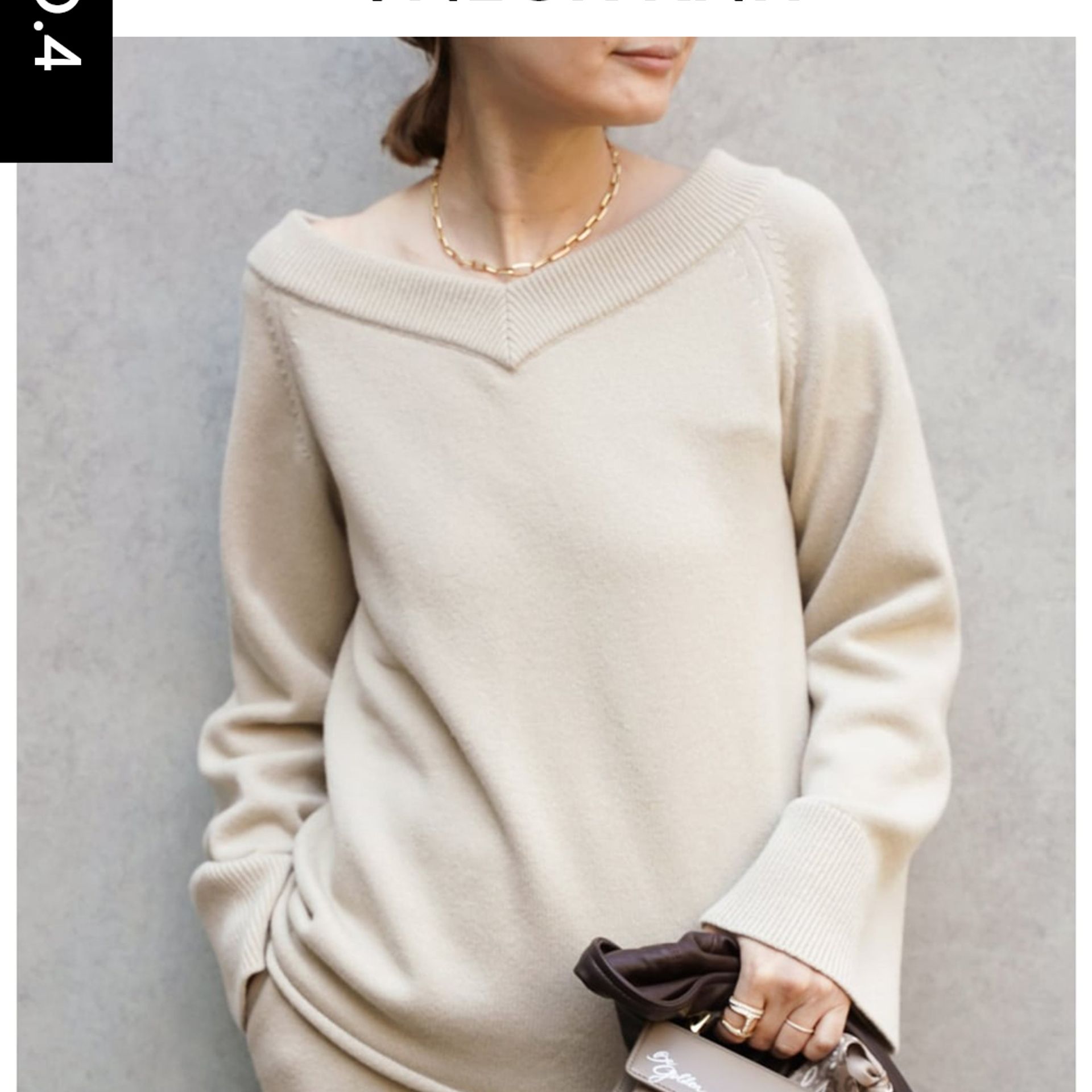 横に開いたVラインがセンシュアルに冬のスタイルを仕上げるニット。