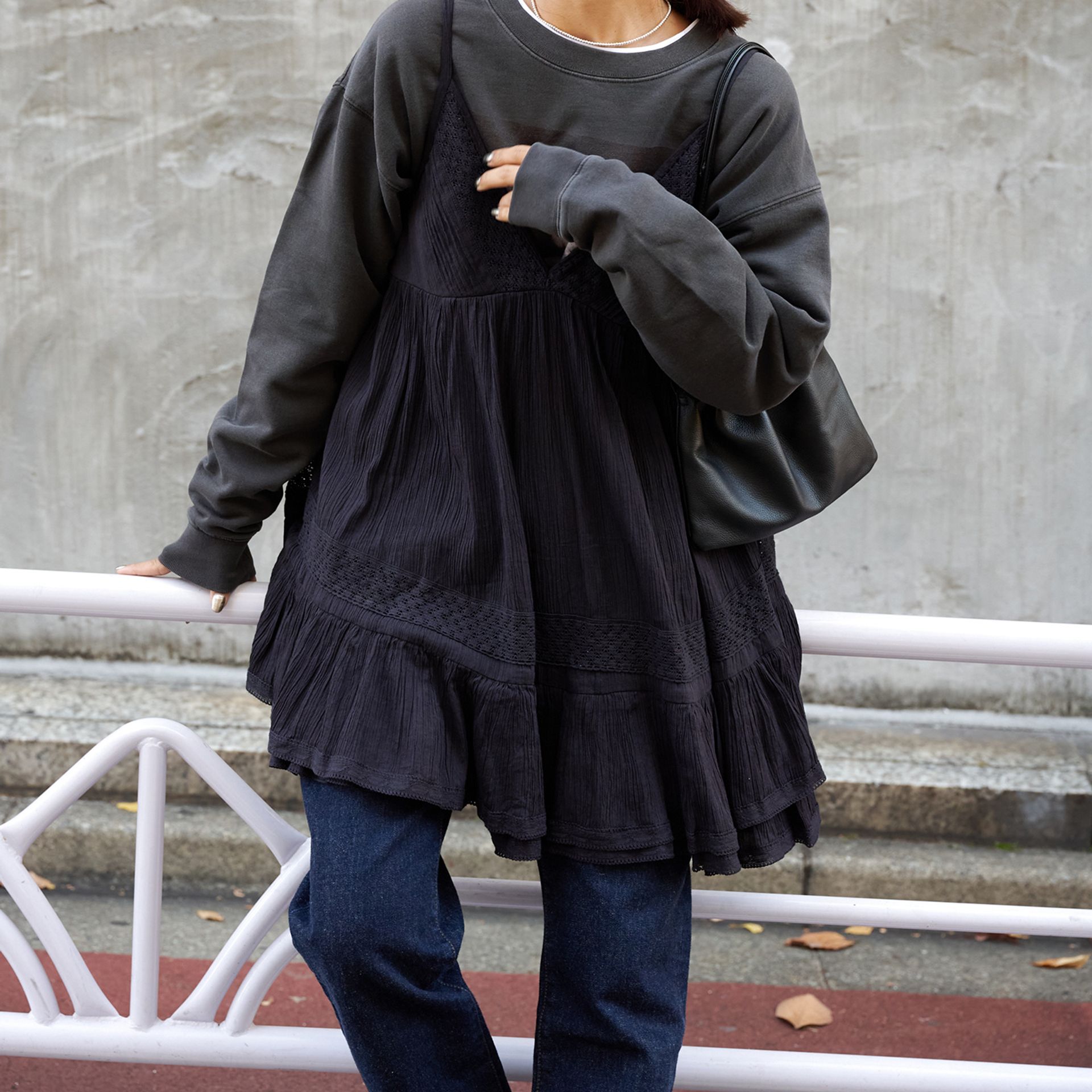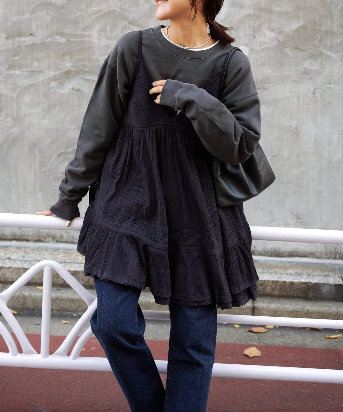 スウェットやニットとのレイヤードアイテムとして。スタイリングにプラスワンできるキャミワンピース。