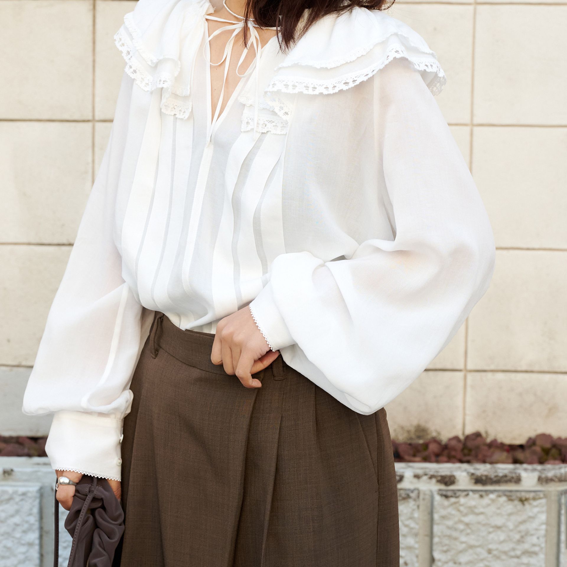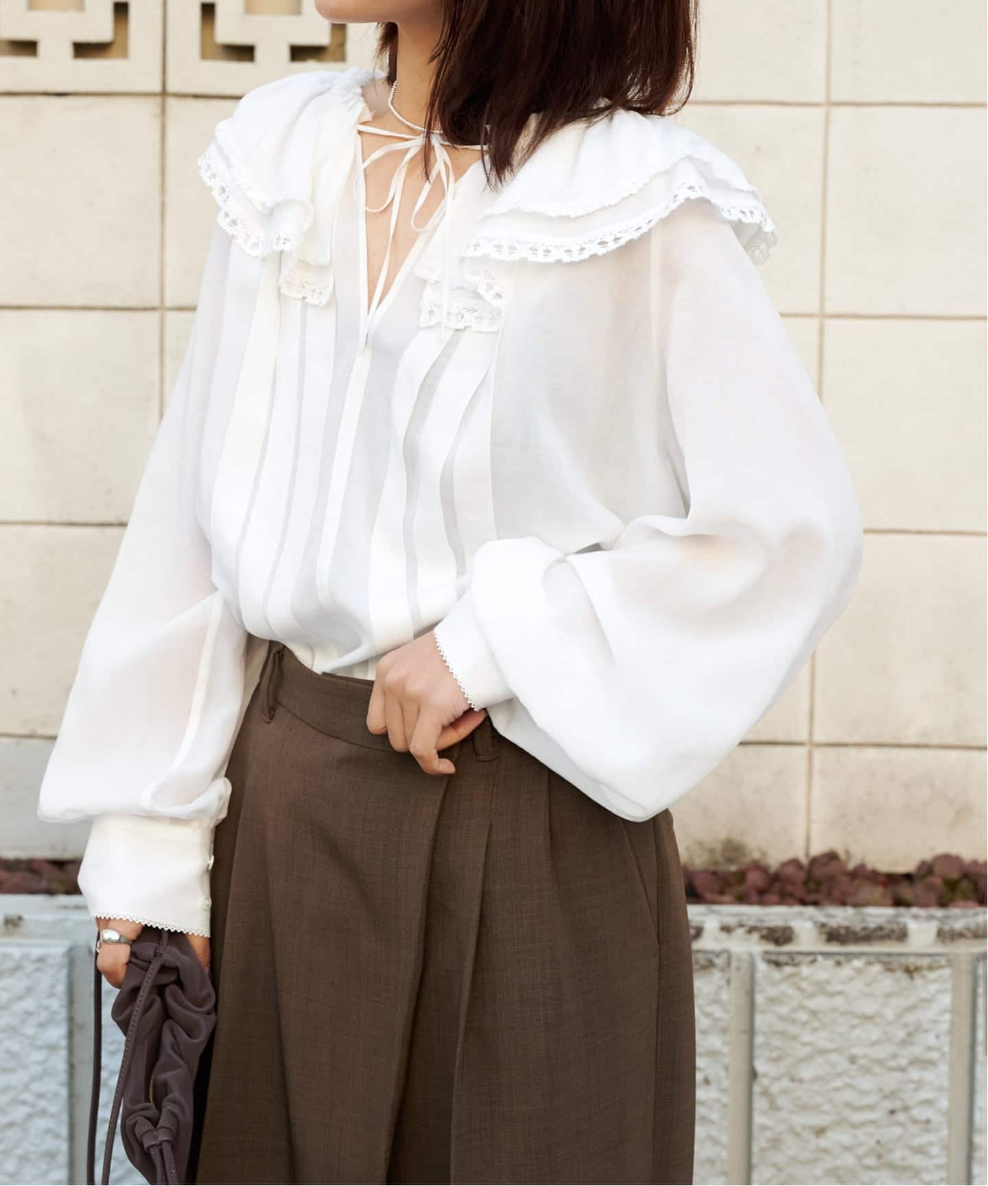 ナチュラルで表情豊かな風合いが魅力のカットワークレースとピンタックレースのシャツ型ブラウス。