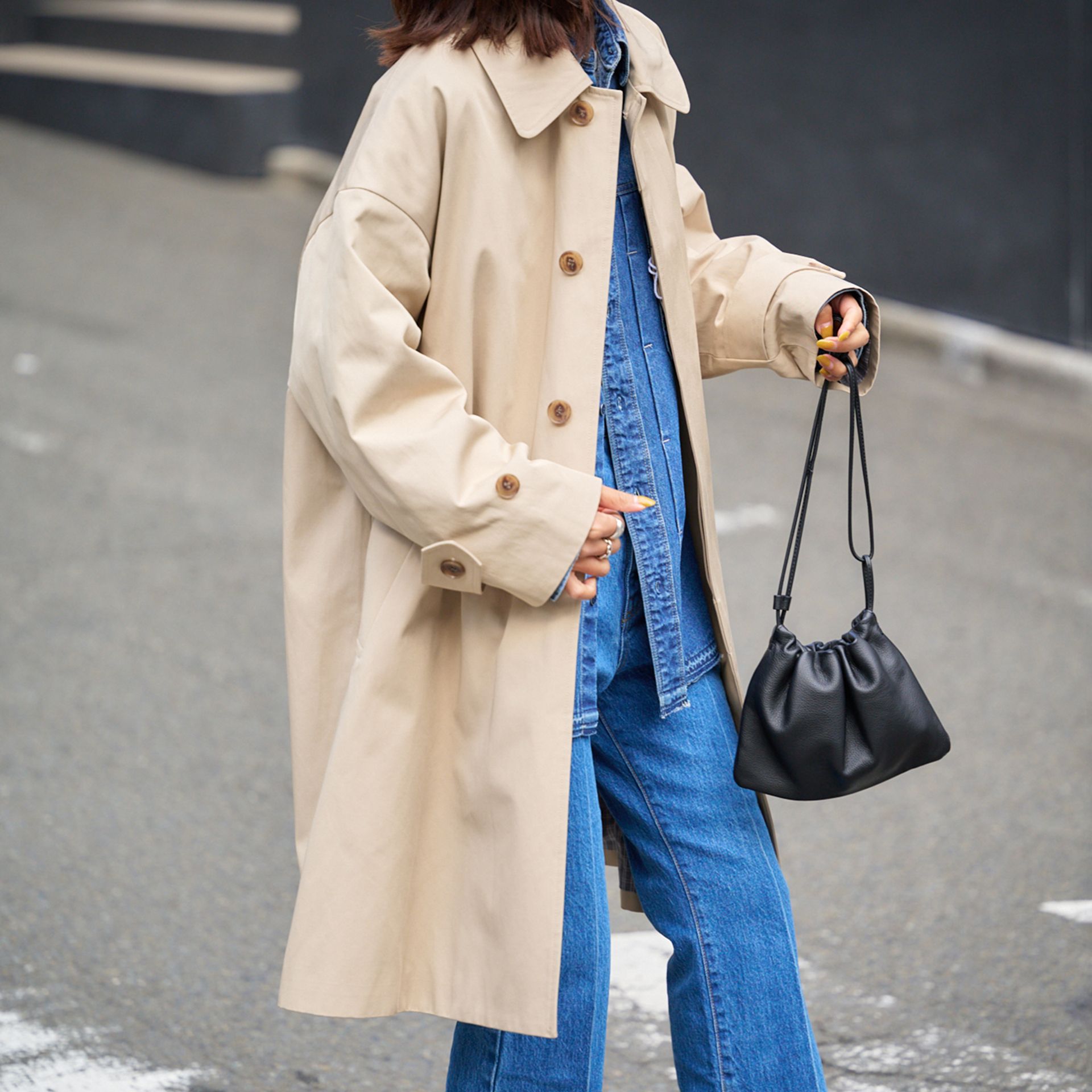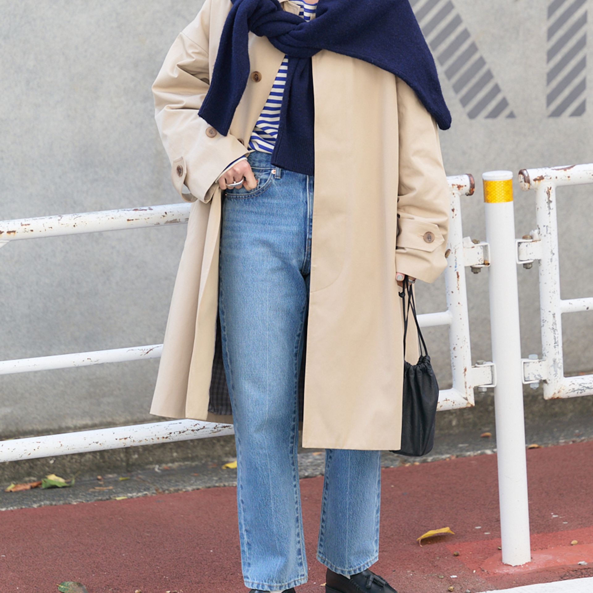 裏地にチェック柄を忍ばせ、気分あがる1着に。