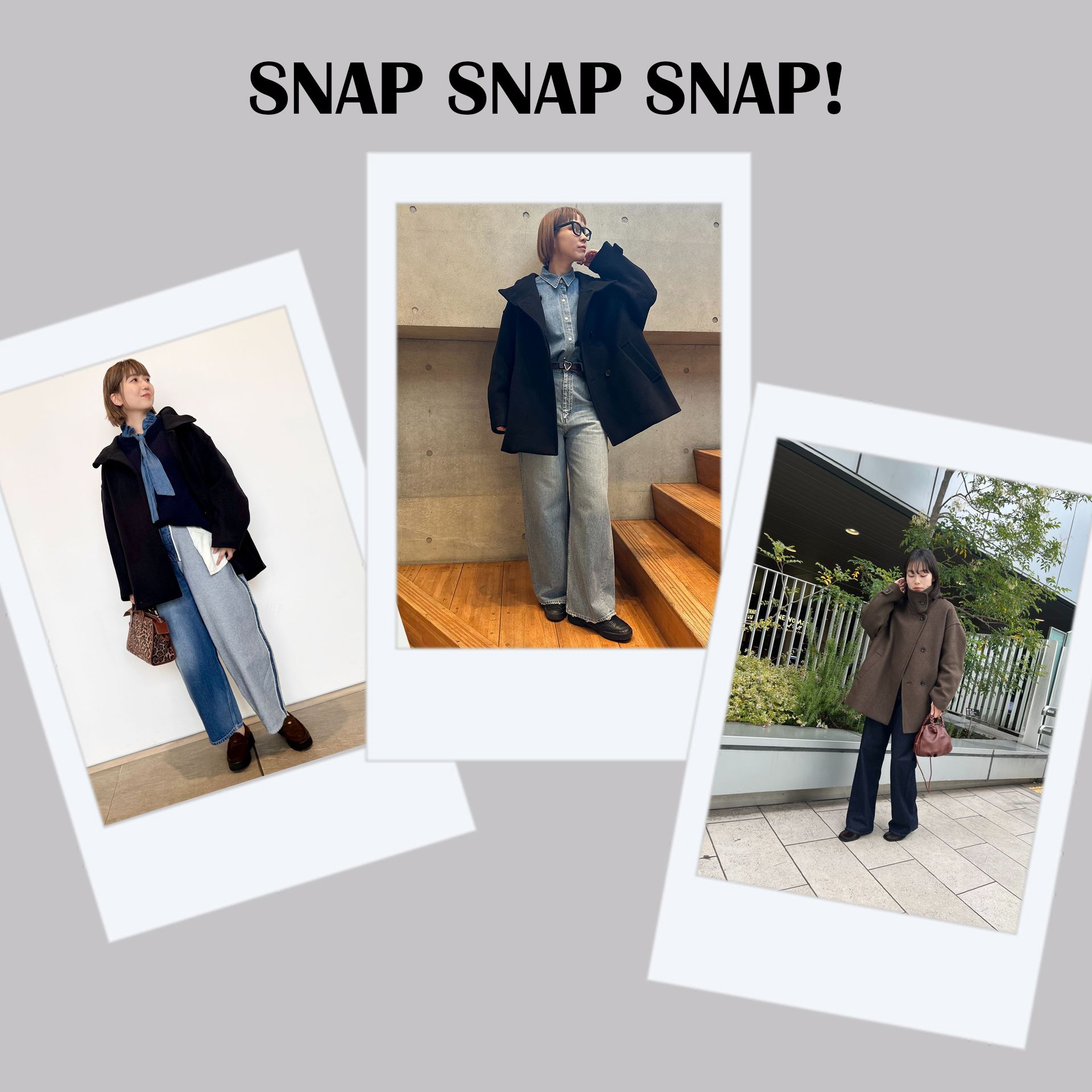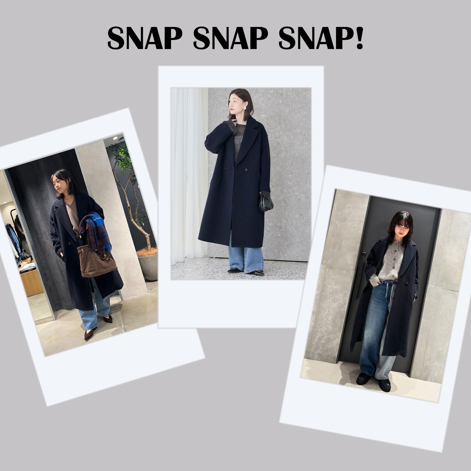 少し大ぶりの襟とダブルのデザインで洗練された雰囲気とさりげない今年らしさを演出。