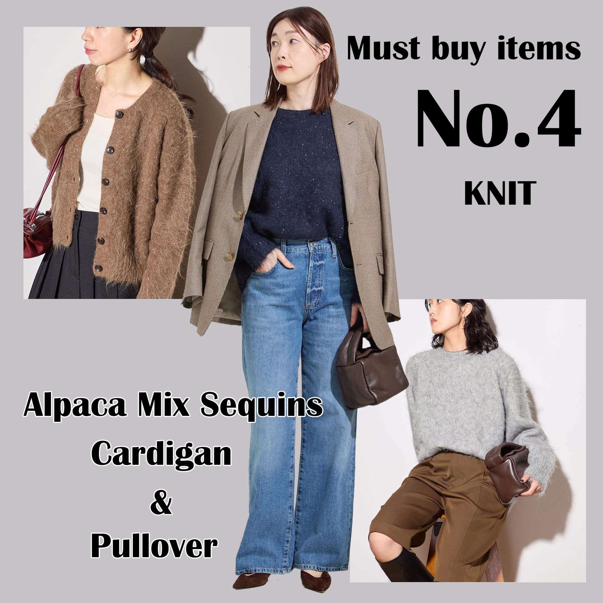 アルパカ混の軽い素材でざっくり編み込んだ軽やかさが特徴のニットプルオーバー&カーディガンは今年もトレンド継続中のスパンコールが華やかな印象に。着映えするスパンコールニットは冬の主役になること間違いなし!
