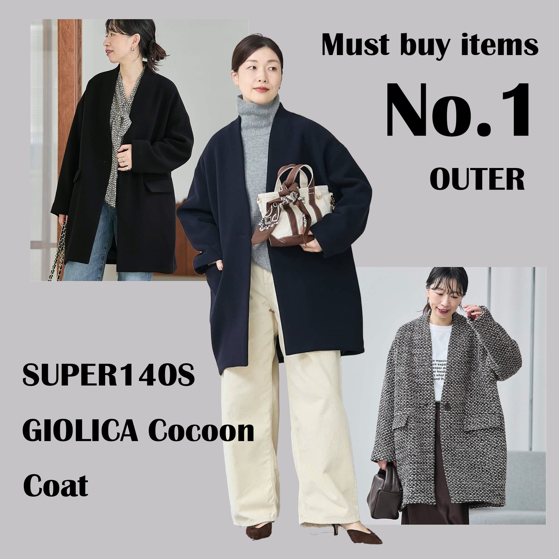 飽きの来ない上品なノーカラーコクーンコート。上品な光沢感に肌触りがとても滑らかなSUPER140S素材を用いたシンプルなブラック&ネイビー。GIOLICAならではの手の込んだツイードが高級感漂うブラックBの3色展開です。見た目にも温かみを感じる大人のための上質なコートです。