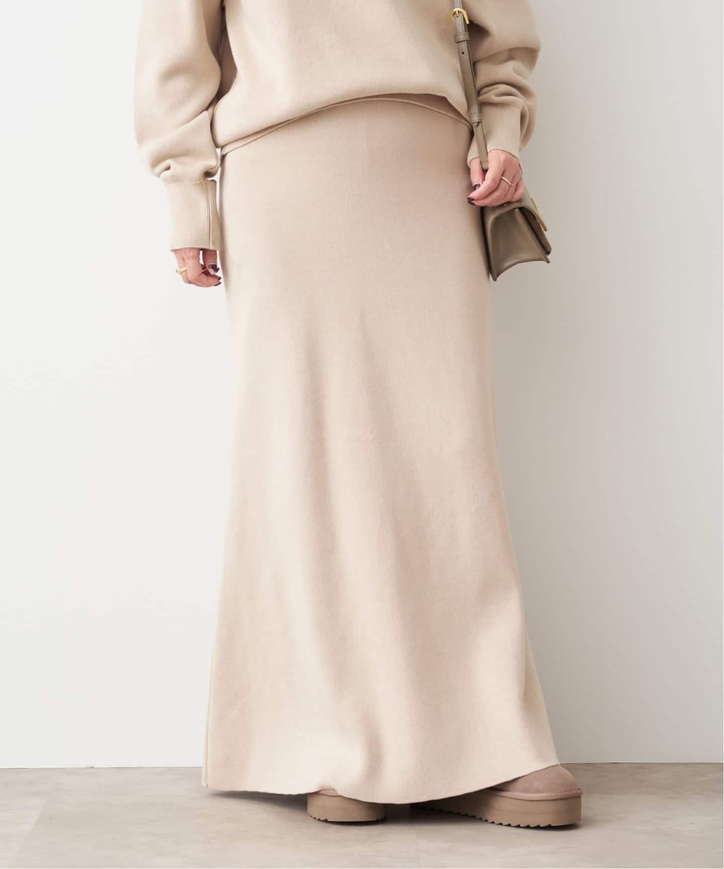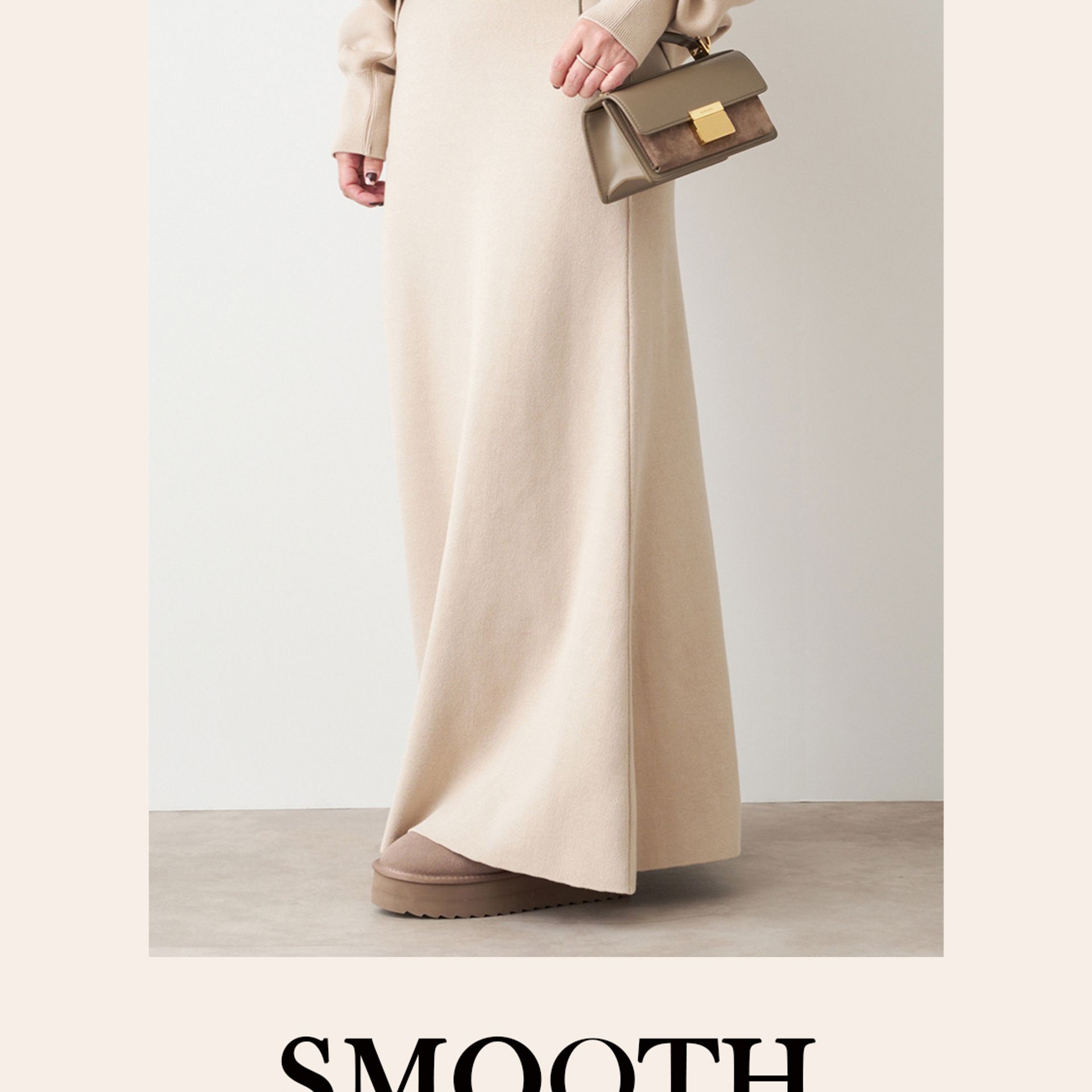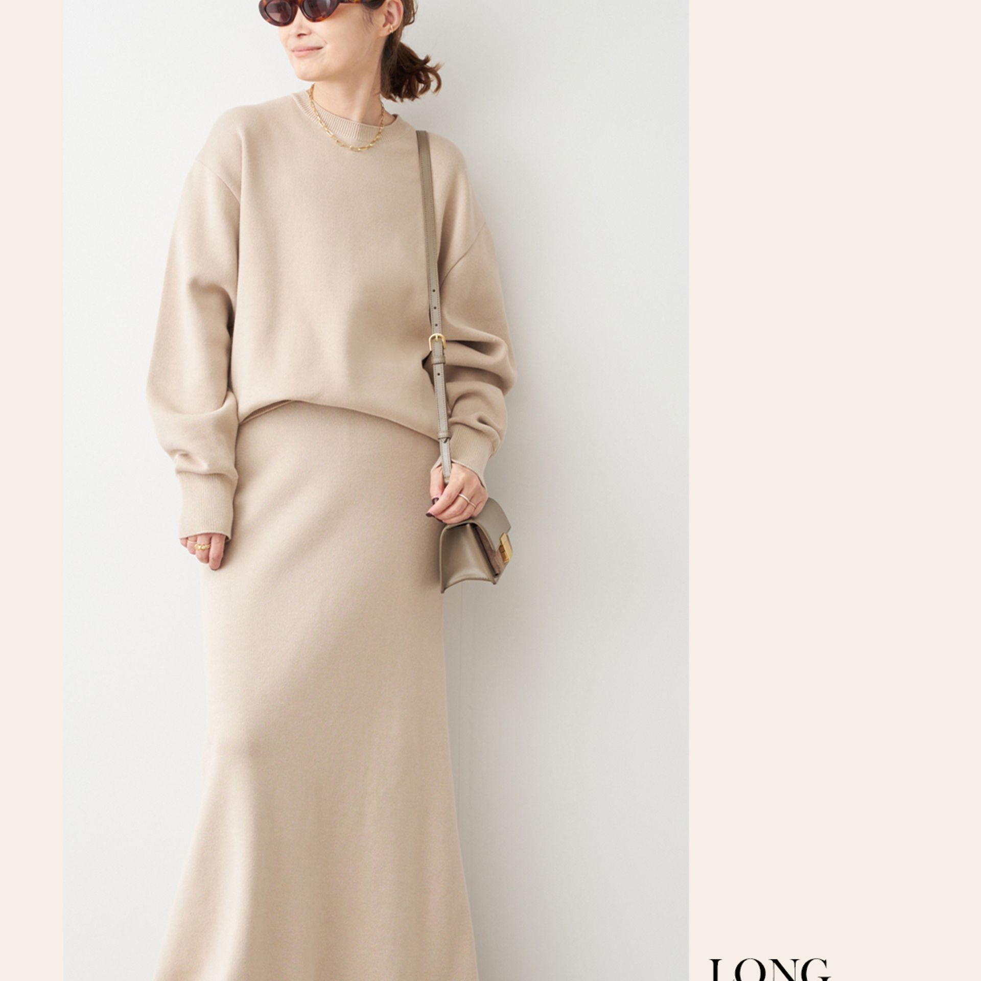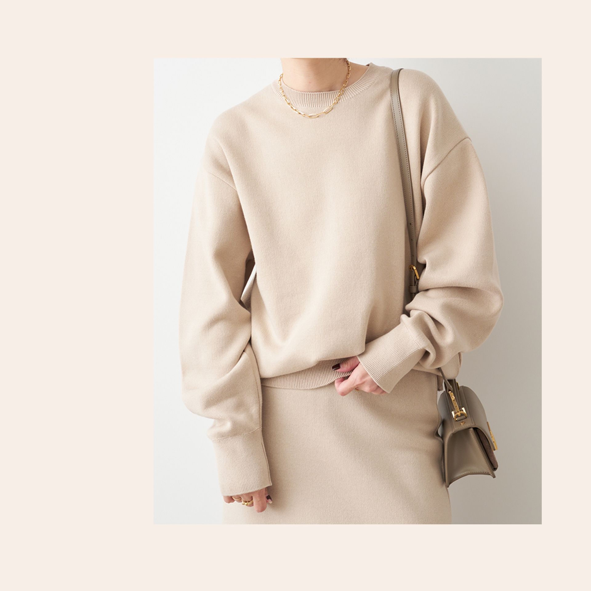 フェミニンなベージュもモダンなシルエットで甘くならない。