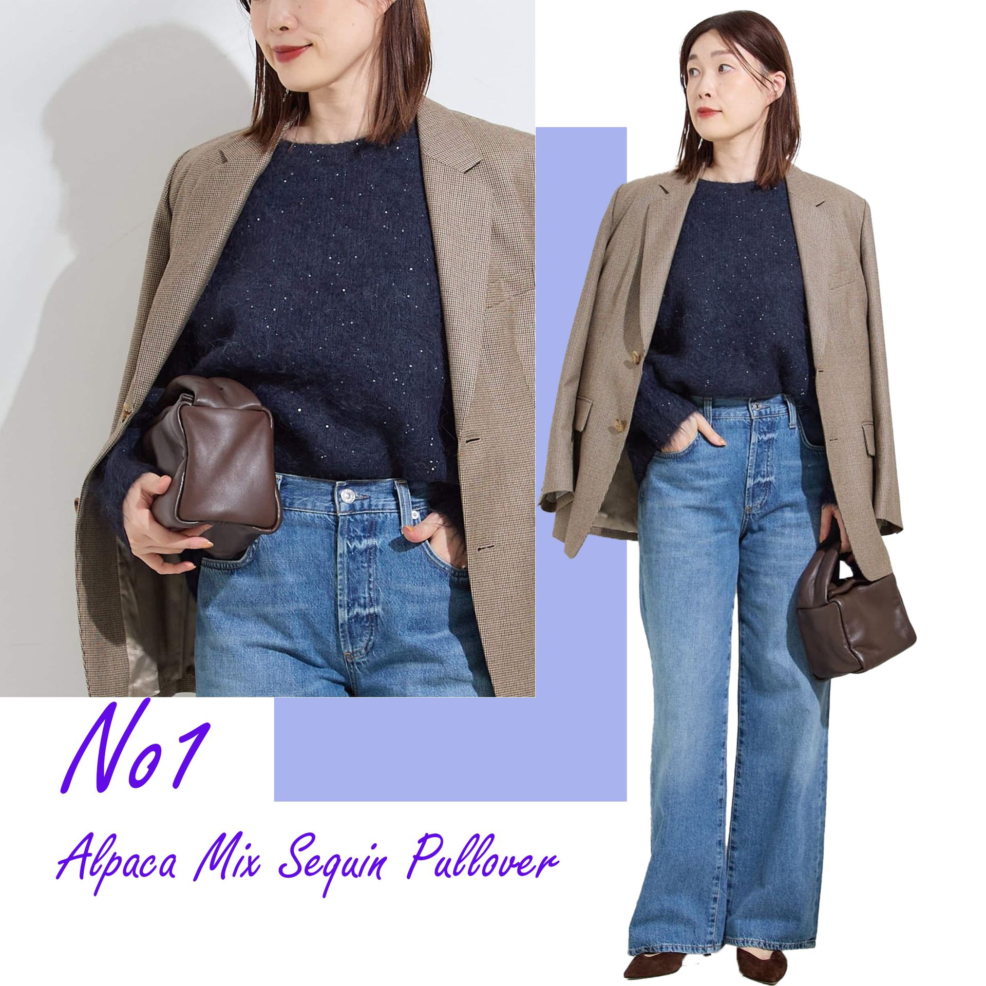 アルパカ混の軽い素材でざっくり編み込んだ軽やかさが特徴のニットプルオーバーは今年もトレンド継続中のスパンコールが華やかな印象に。