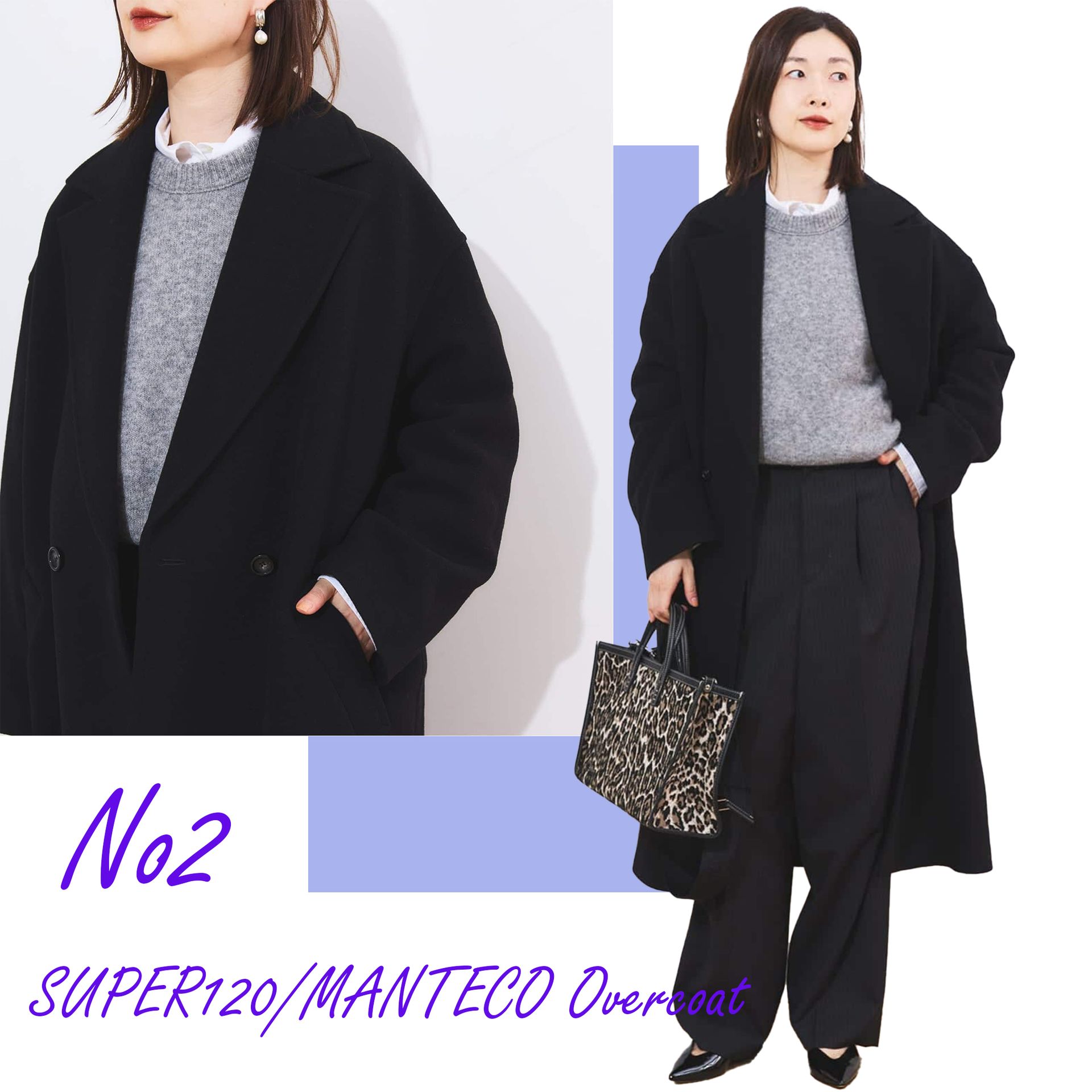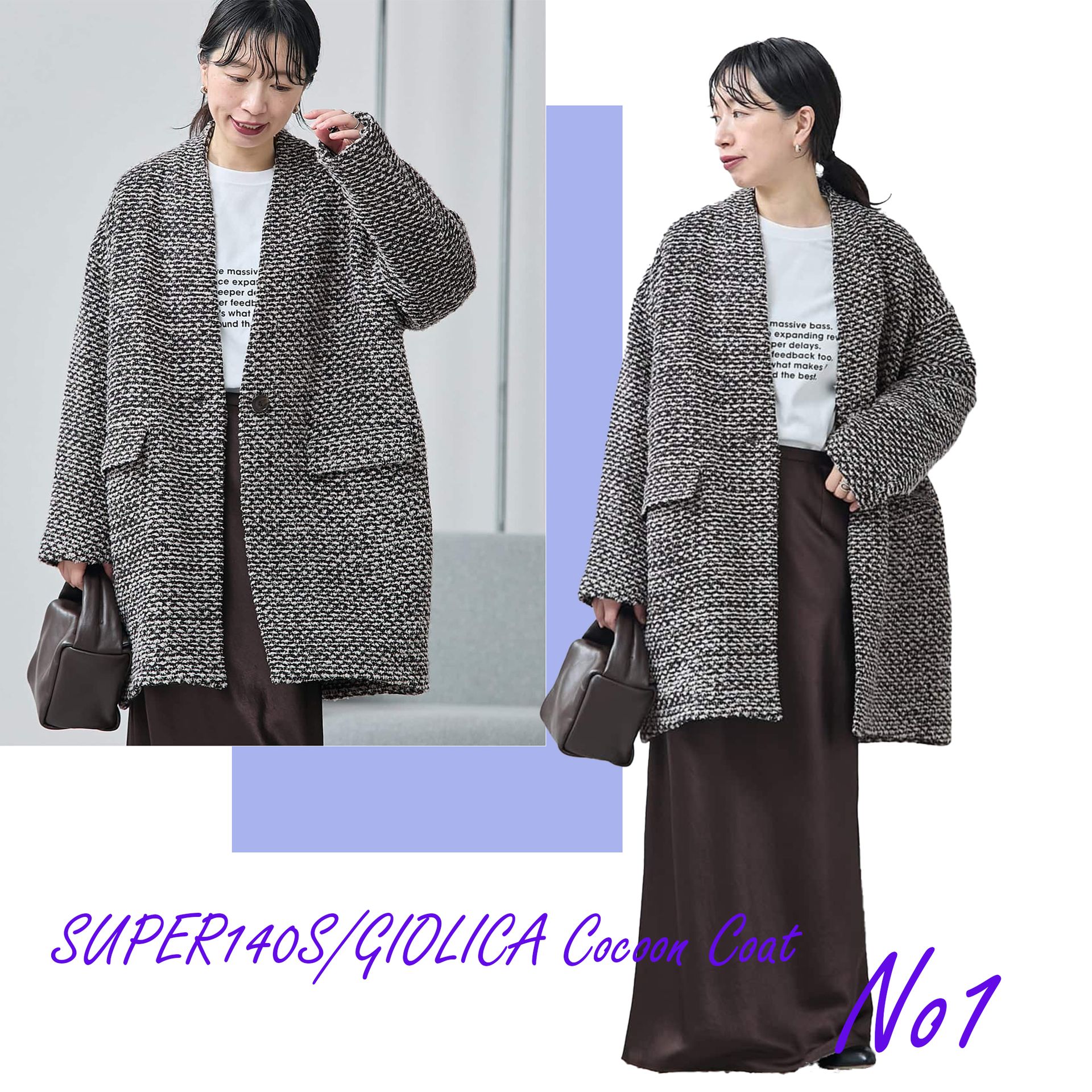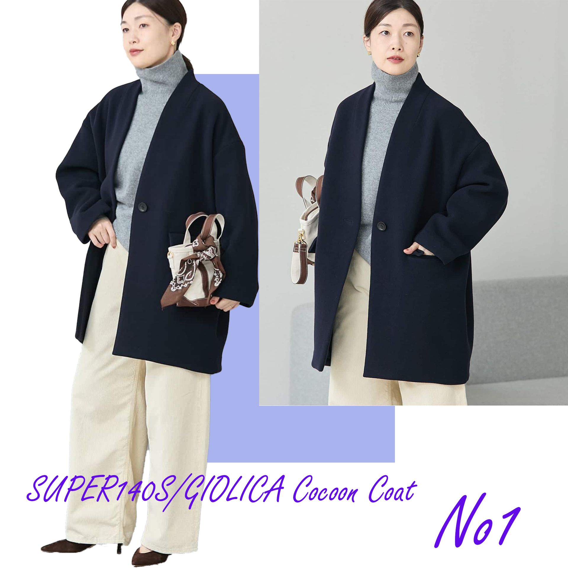 飽きの来ない上品なノーカラーコクーンコート。上品な光沢感に肌触りがとても滑らかなSUPER140S素材を用いたシンプルなブラック&ネイビー。