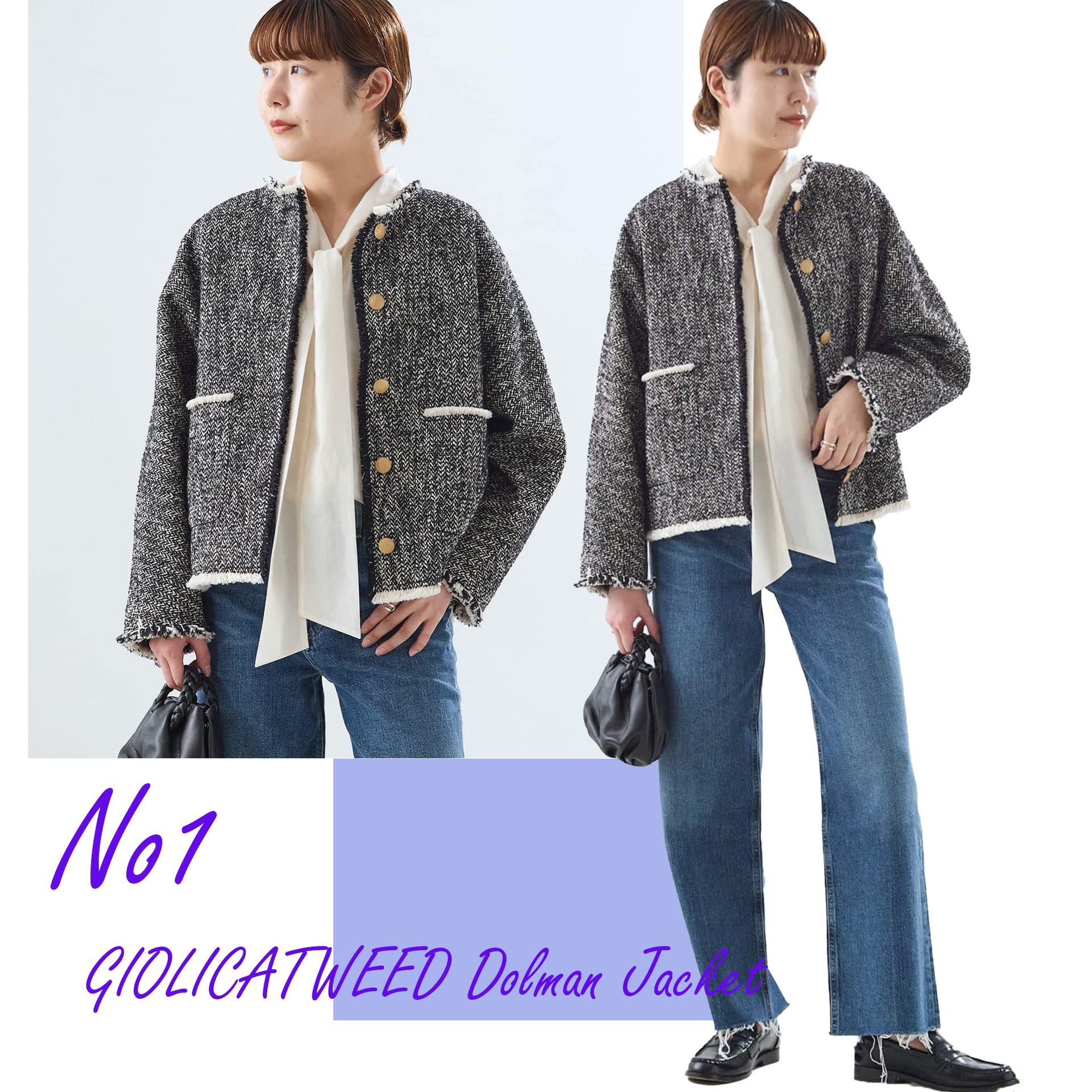 イタリアのGIOLICA社の生地を使用したツイードジャケット。肩がおちたゆったりとしたシルエットで、コンサバにならないようなサイズ感になっています。