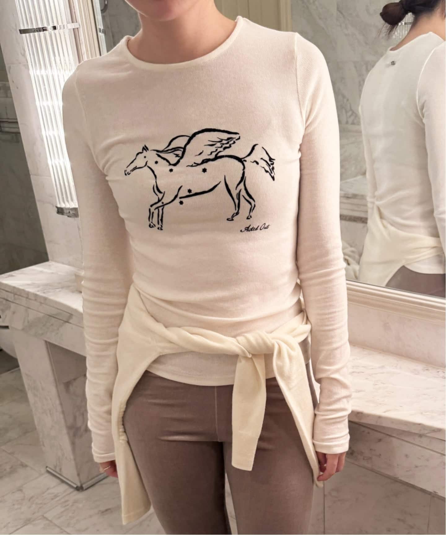 軽やかな印象のボディに、オリジナルのフロッキープリントを施したsweat top