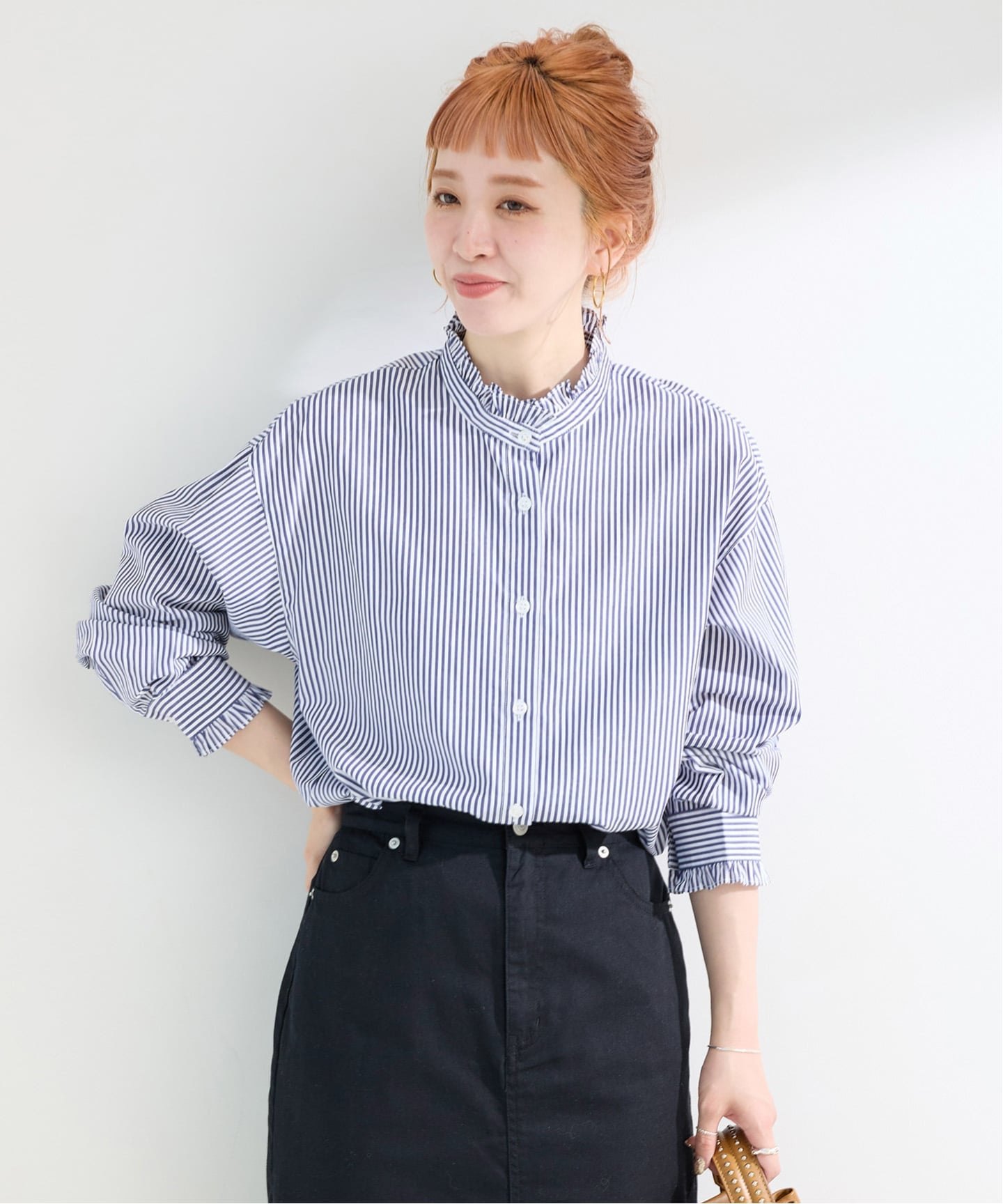 スタンドカラーに控えめなフリルをあしらった人気の着映えブラウス。