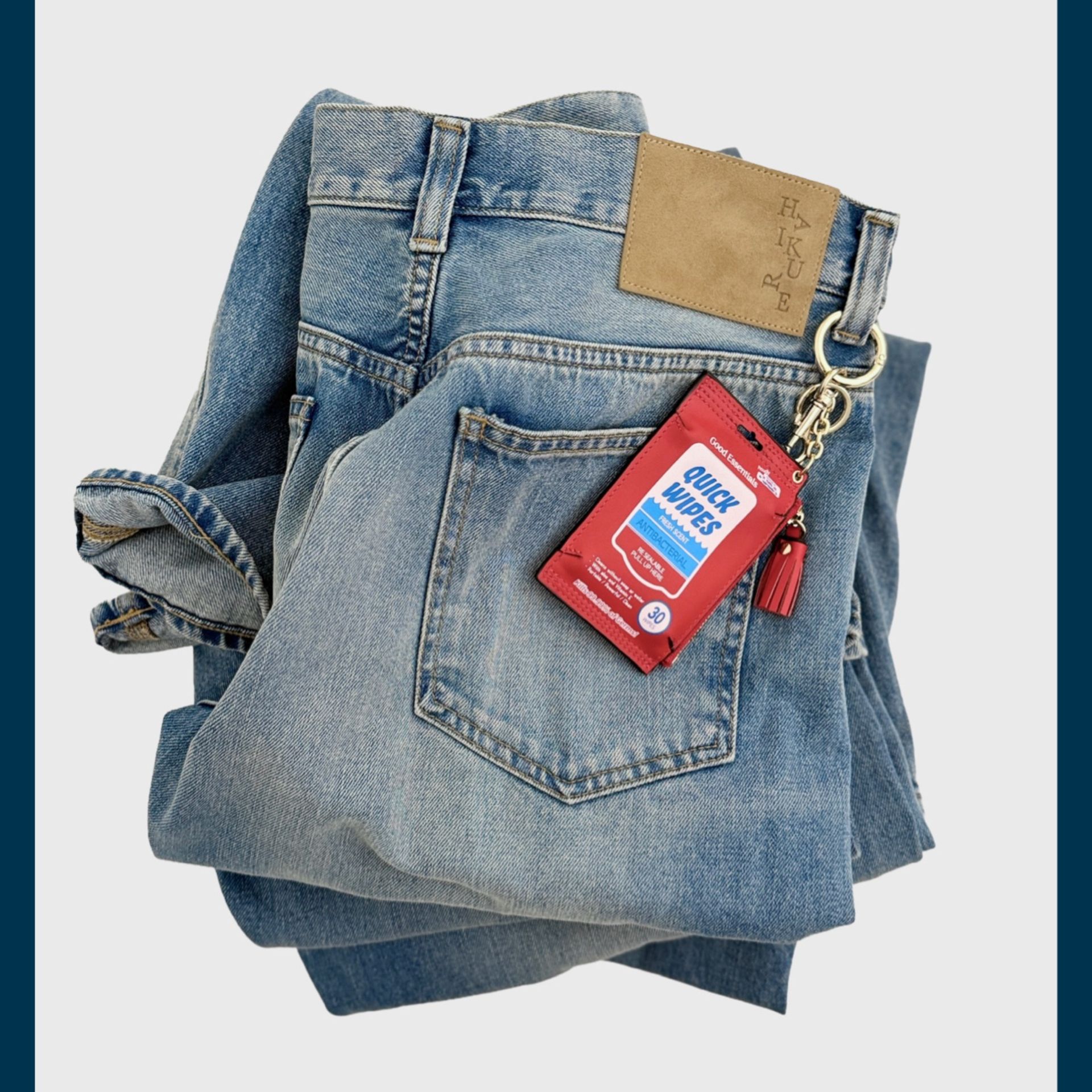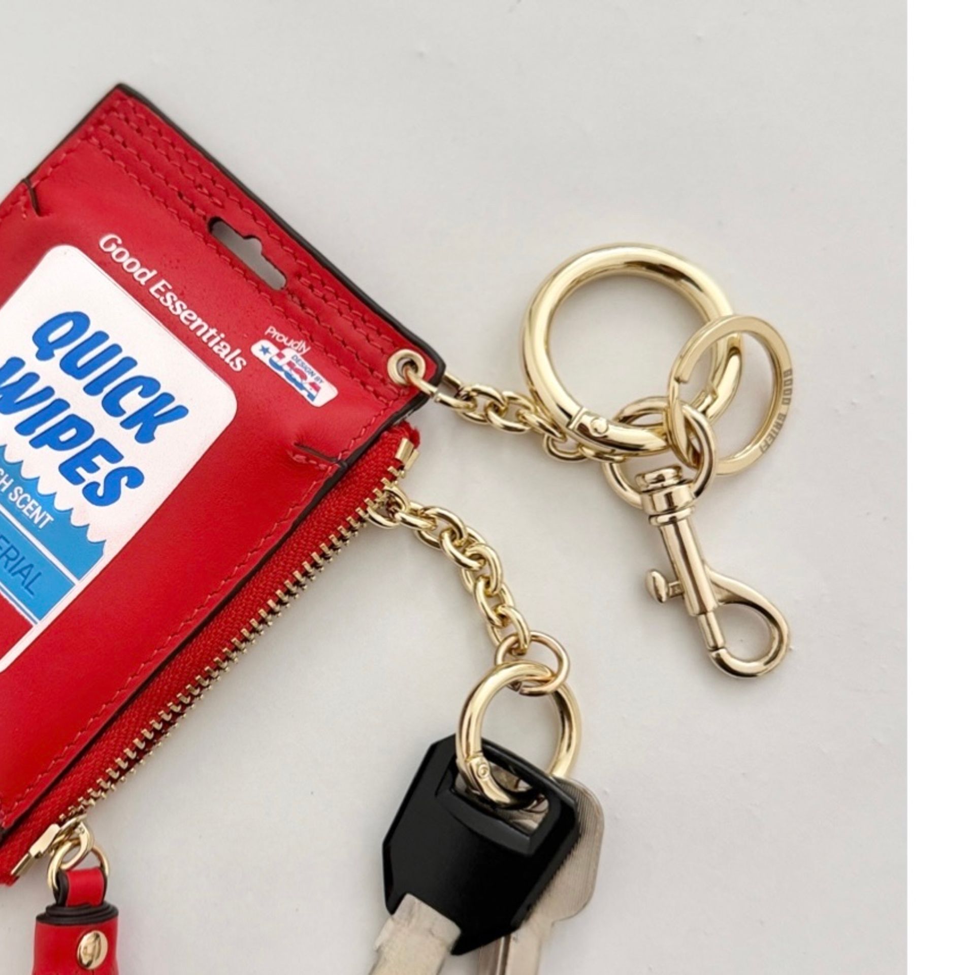 アメリカのウェットティッシュのパッケージからインスパイアされたデザインのキーケース。