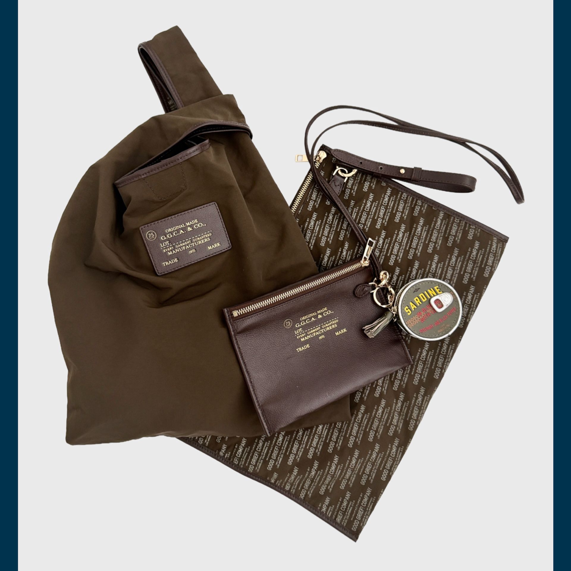 ブラウンカーキのシックな配色にGOOD GRIEF!こだわりのグラフィックが効いたデザイン。大、小のポーチ付きでいろんなアレンジをしながら自分らしい使い方を楽しめるバッグは必見!サブバッグとしても、スタイリングの外しにもおすすめです。縁取られたレザーがリュクス感を醸す大人のためのエコバッグです。