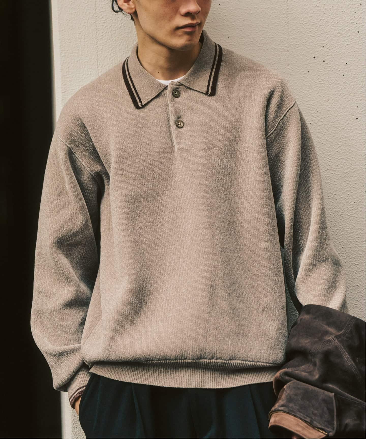 モール糸ならではの柔らかな肌触りと、控えめながら上品な光沢感が特徴のニットポロ。一枚で着ても成立し、アウターのインでも表情を失わないため、冬から春への端境期にちょうどいい存在です。着心地と見え方、どちらも妥協しない一枚。