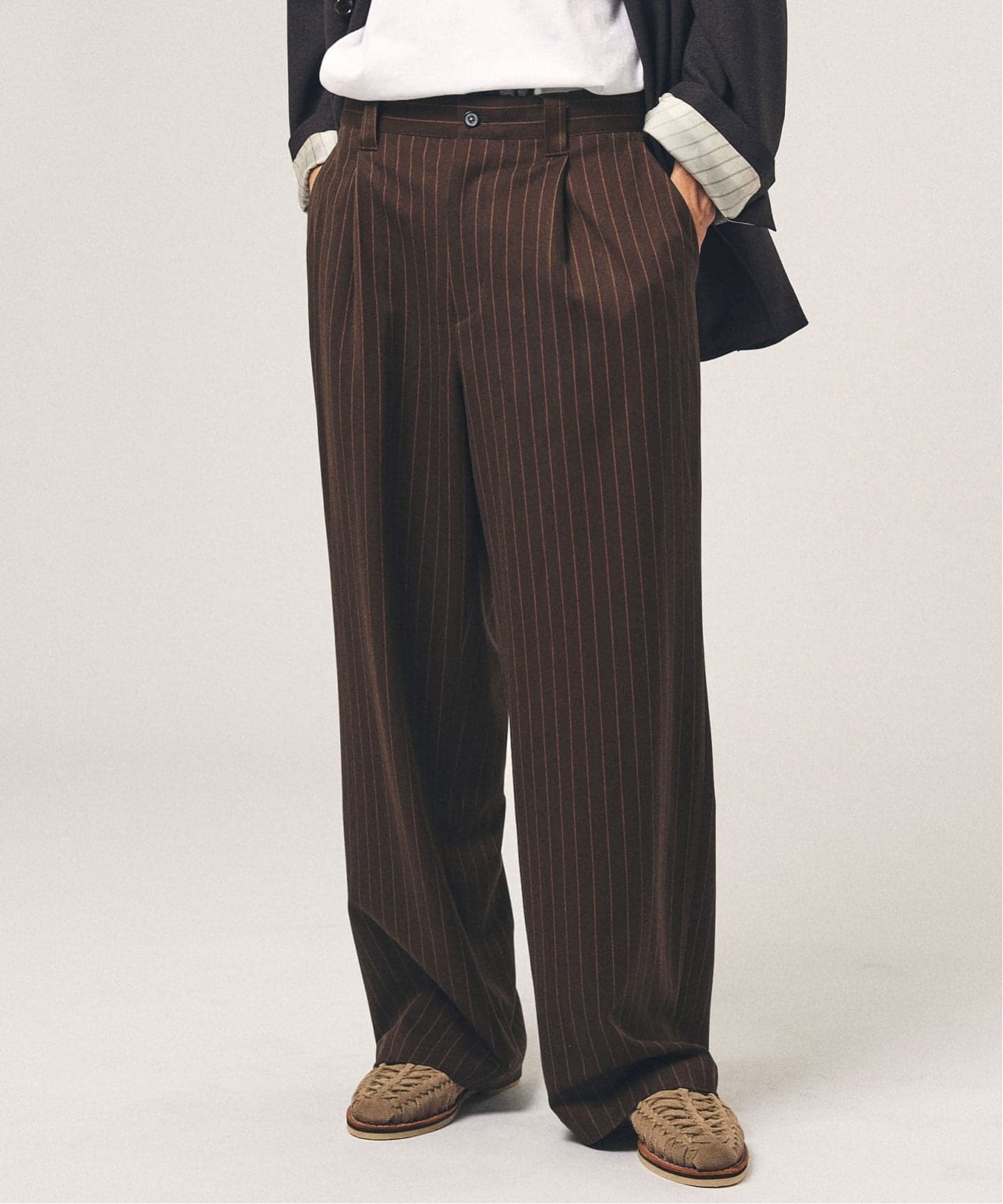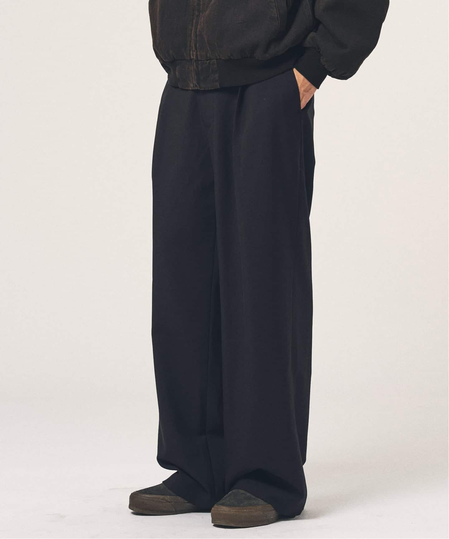 TRツイル素材を使用し、イージーな穿き心地とクリーンな見え方を両立したワイドパンツ。落ち感のある生地がシルエットをきれいに整え、ラフになりすぎないのがポイント。デイリーに頼れる、完成度の高い一本です。