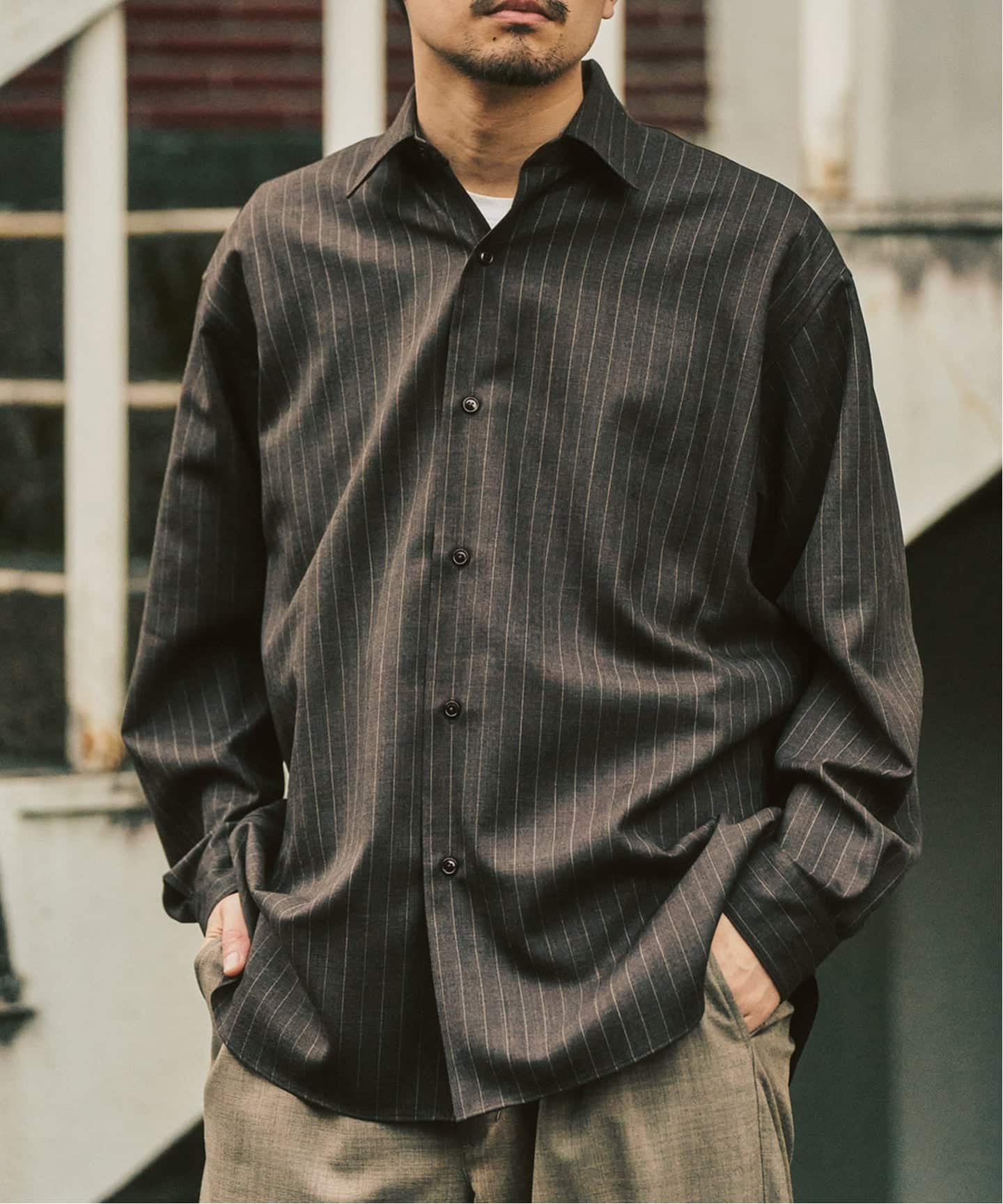 国内生産ならではの丁寧な縫製と、産地にこだわって選ばれたウール素材を使用したレギュラーシャツ。縫い代や運針の美しさが、着たときの収まりの良さにつながり、ニットのインナーとしても、一枚着としても品よく成立します。“作りの良さ”が、そのまま着心地に表れる日本製の一枚です。