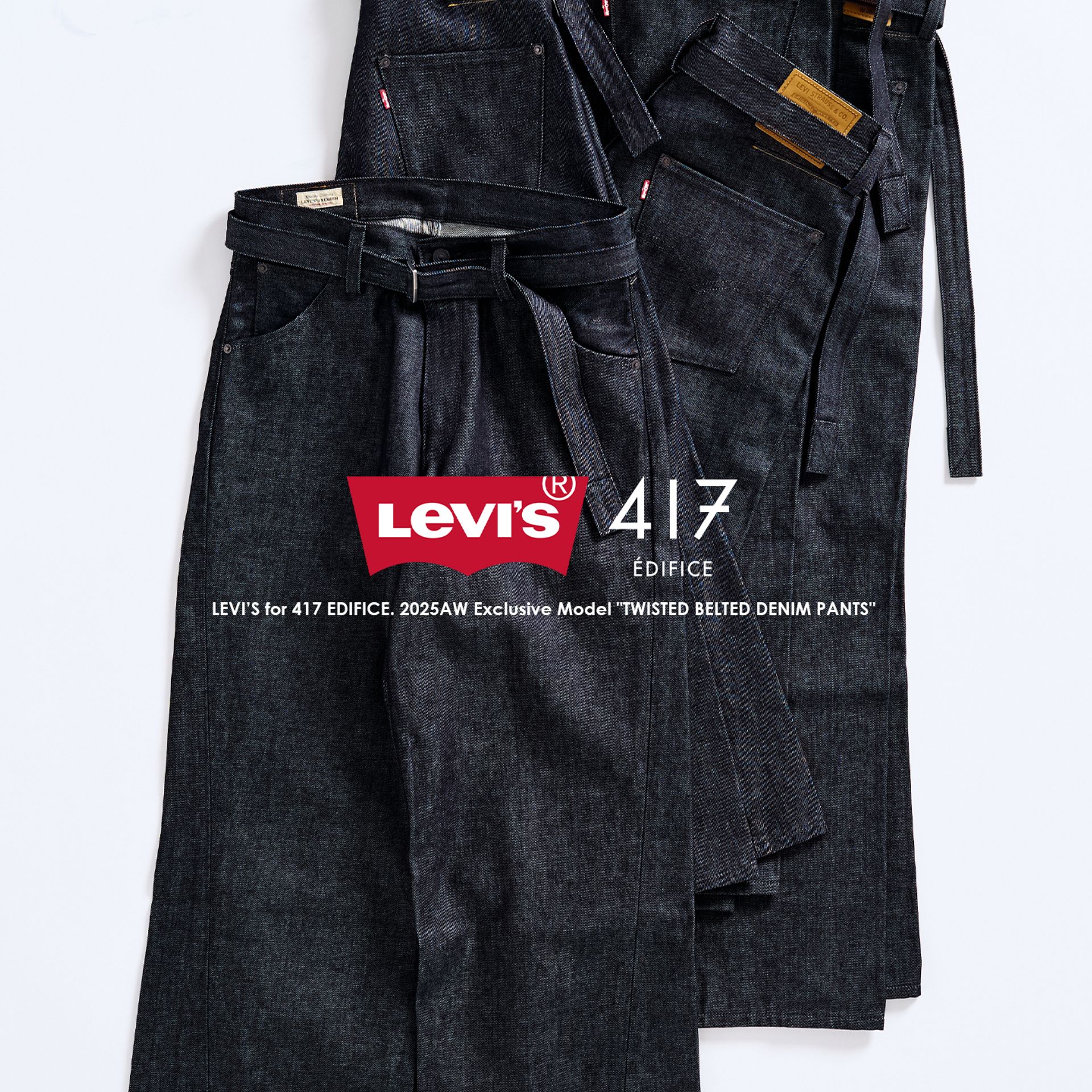 ベースは、Levi’s®の名作ベルテッドデニム。そこに417らしい解釈を加え、立体的にねじれたパターン設計とベルトディテールを組み合わせることで、タイムレスでありながら、今の空気感をまとったシルエットになっております。一度完売し、待望の追加販売が決定したこのモデルをお見逃しなく!