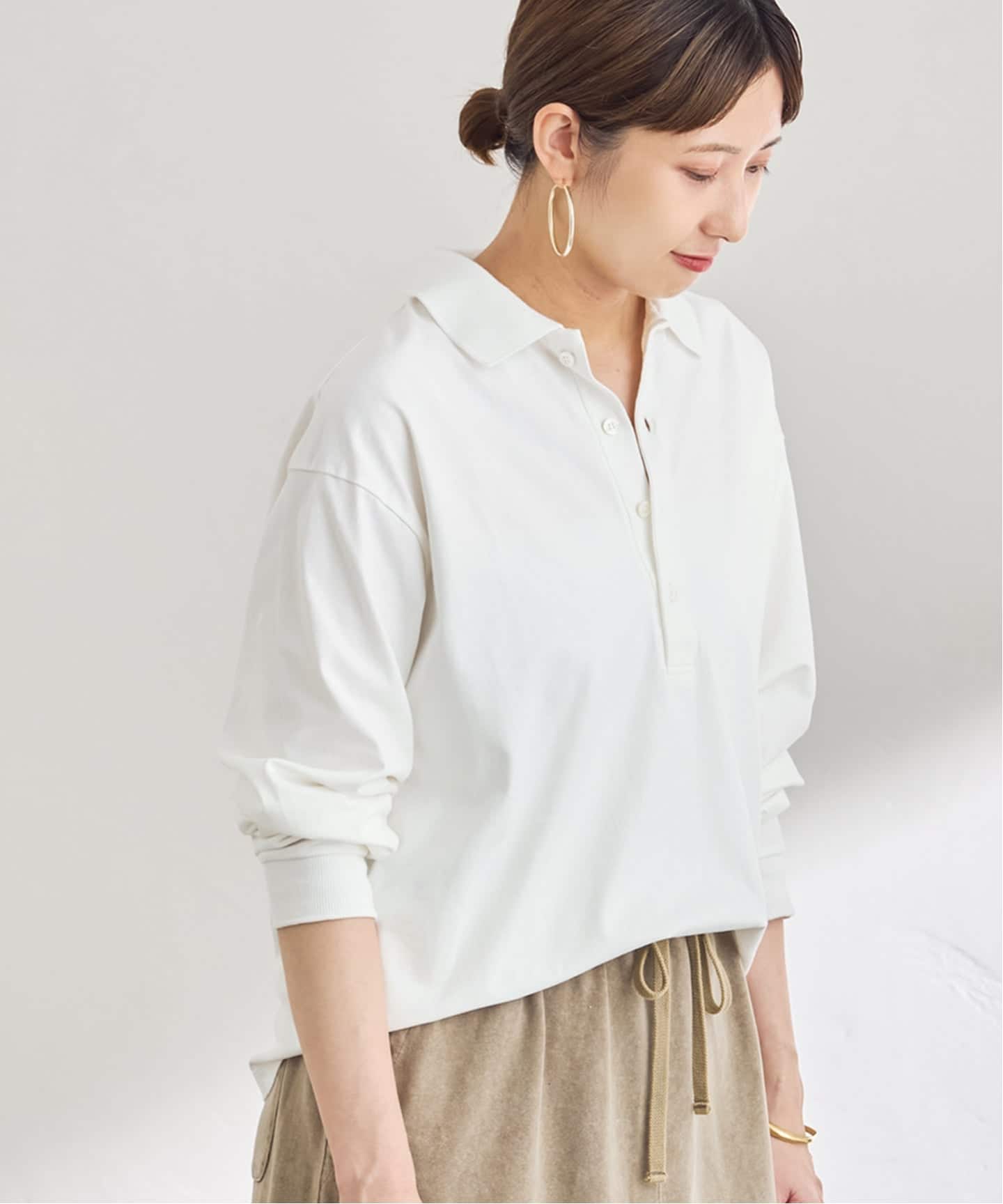 インナー使いに適したコンパクトなサイズ感で、襟元は自然にくしゅっとさせて抜け感を演出。