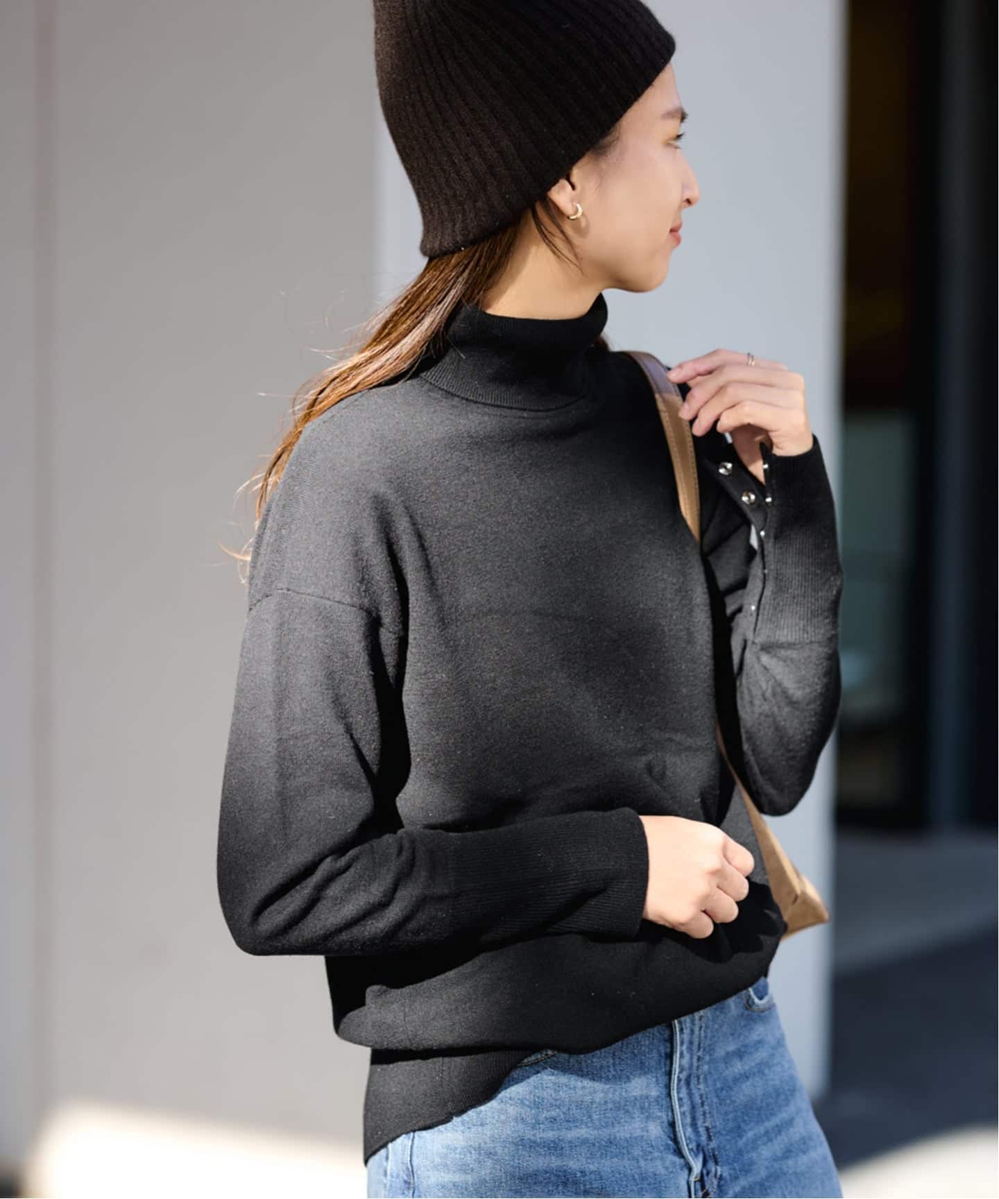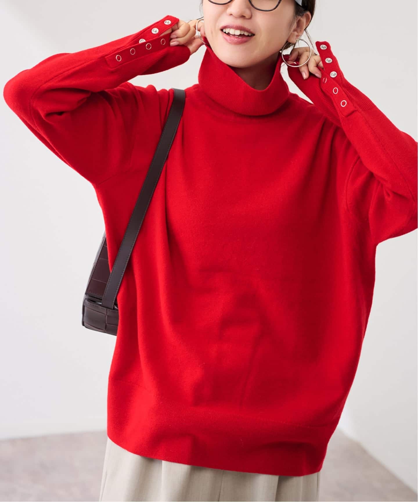 程よい長さのタートルネックは、きちんと折り返したり、折らずにくしゃっとさせたりとお好みでアレンジいただけます。