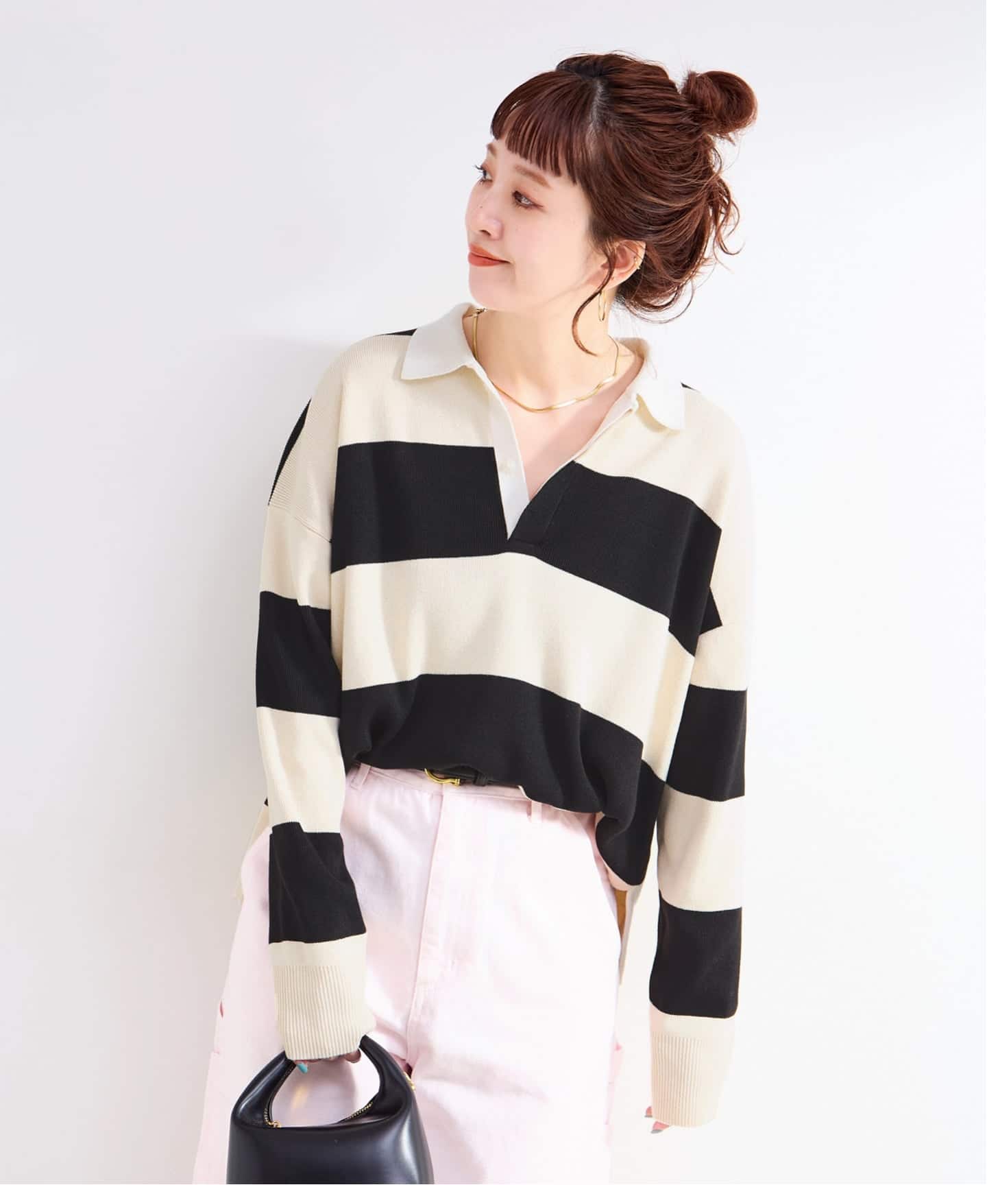 ソウバリ編みにし程よい厚み感のあるニット生地で、太めのボーダーが目を惹くニットプルオーバーです。白衿付きできちっと感もあり、脇スリットが入っていてボトムのフロントインスタイルもできるデザインとなっています。