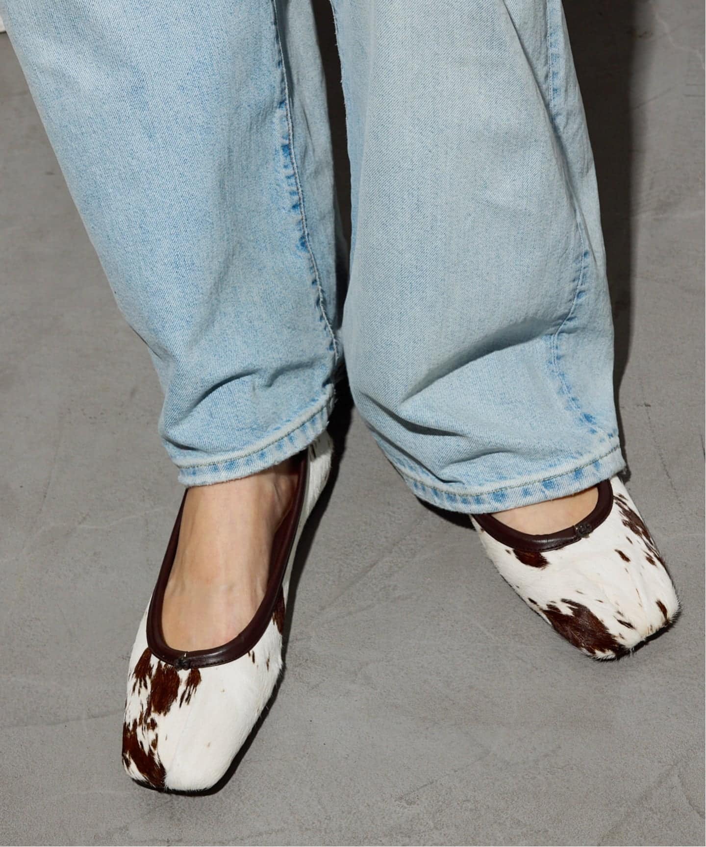 人気のフラットにヘアカーフのホルスタイン柄が登場!ホワイトベースで足元に明るさをプラスできる1足です。