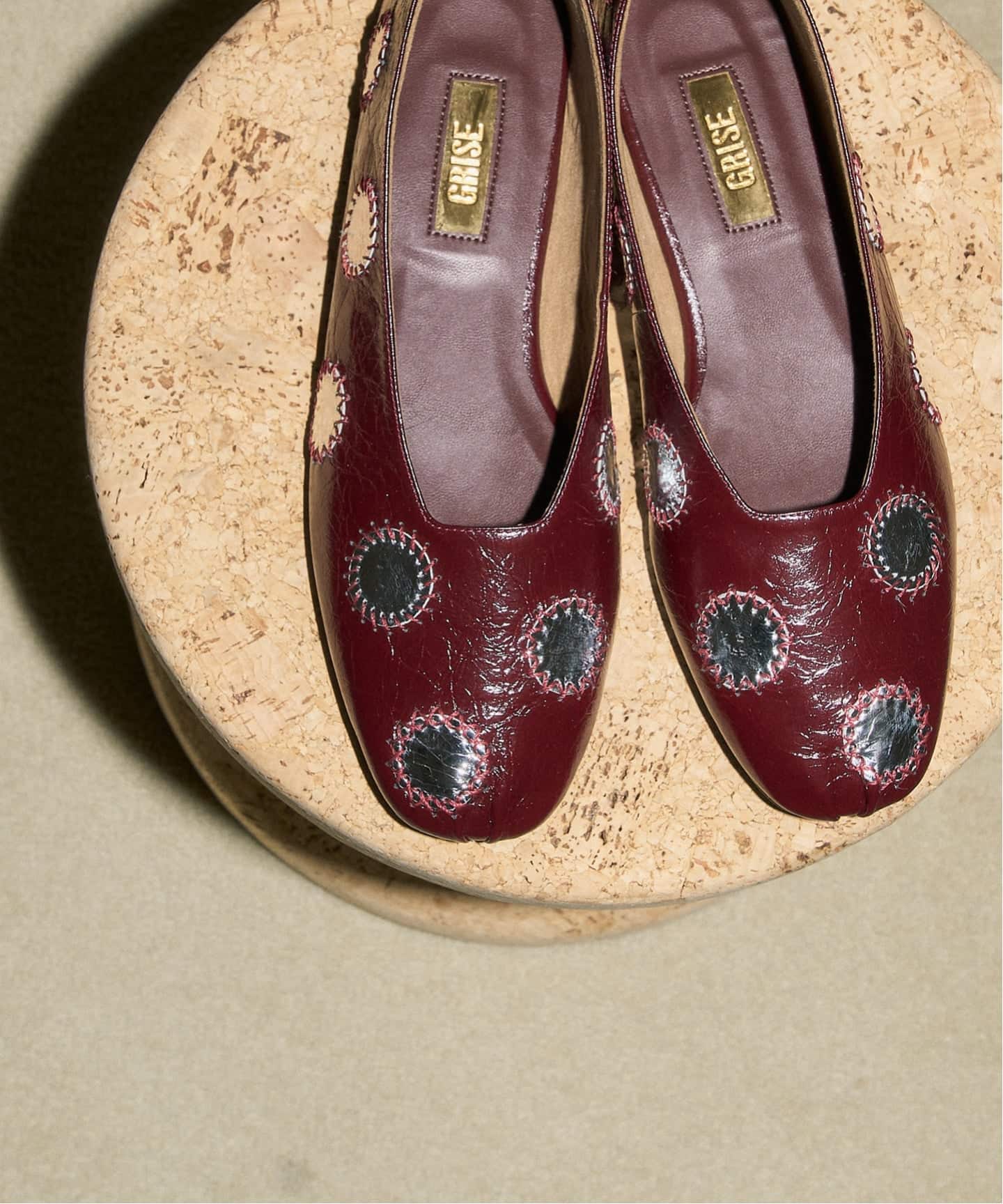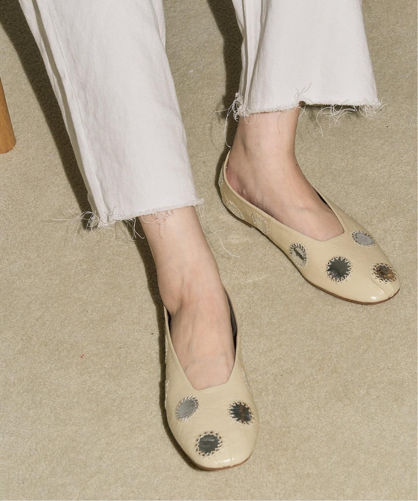 繊細なミラーワークをアッパーに施したフラットシューズ。クラフト感のあるデザインですが、ツヤのある人工的なレザーを組み合わせたことでモダンな表情に。