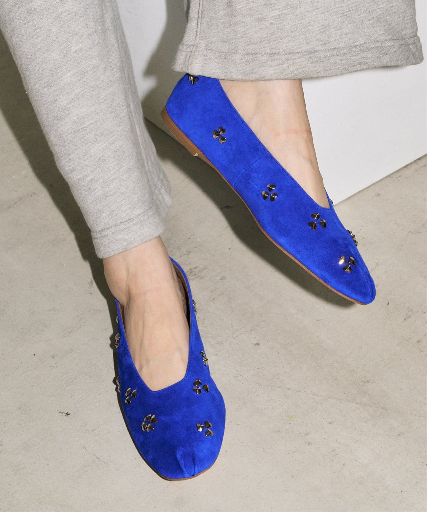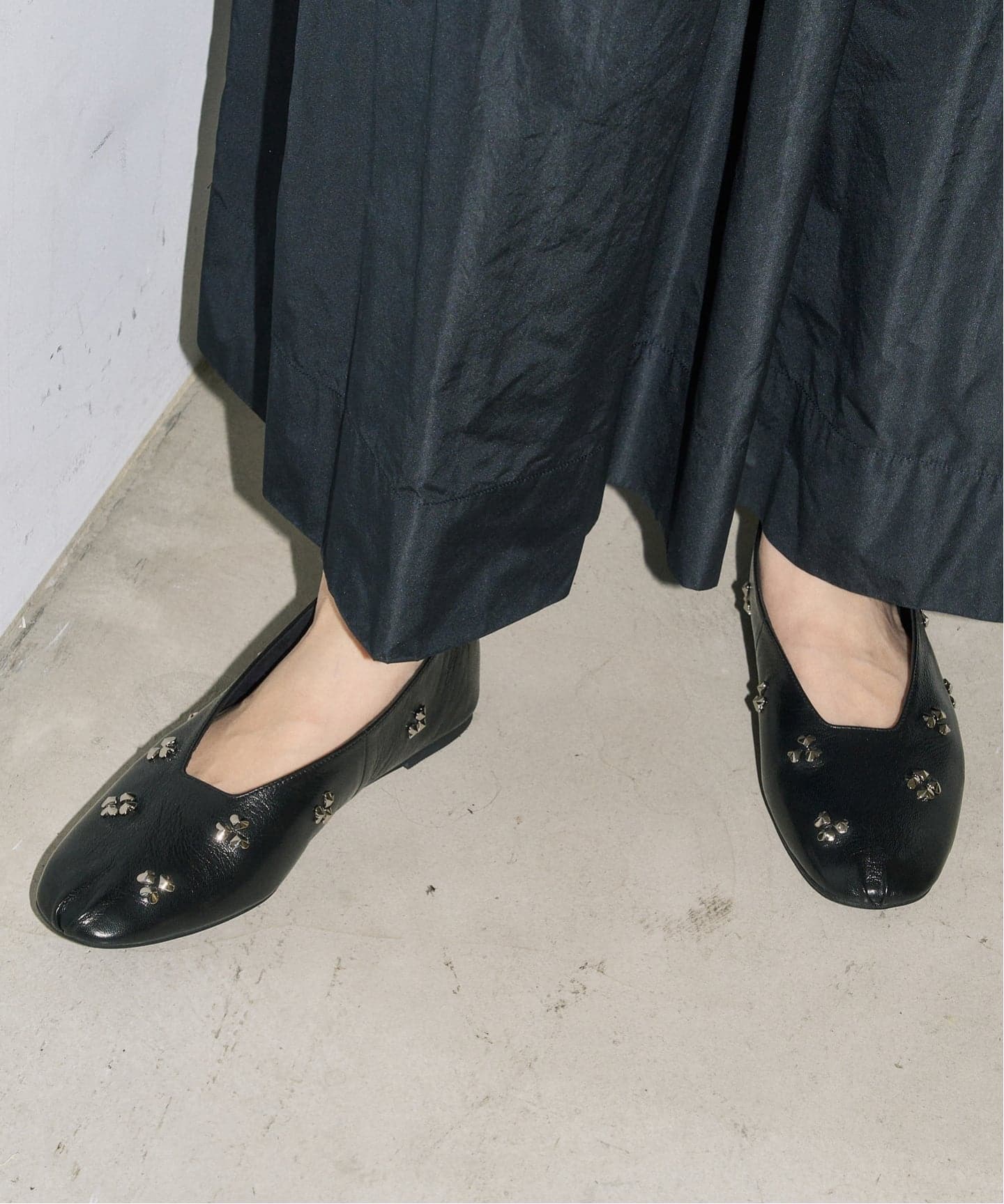 ハートのスタッズをラッキーモチーフの1つでもあるクローバーの様にデザインし、アッパーに散りばめたフラットシューズ。芯のないソフトな仕立てとシープレザーで、足を柔らかく包み込んでくれる1足です。