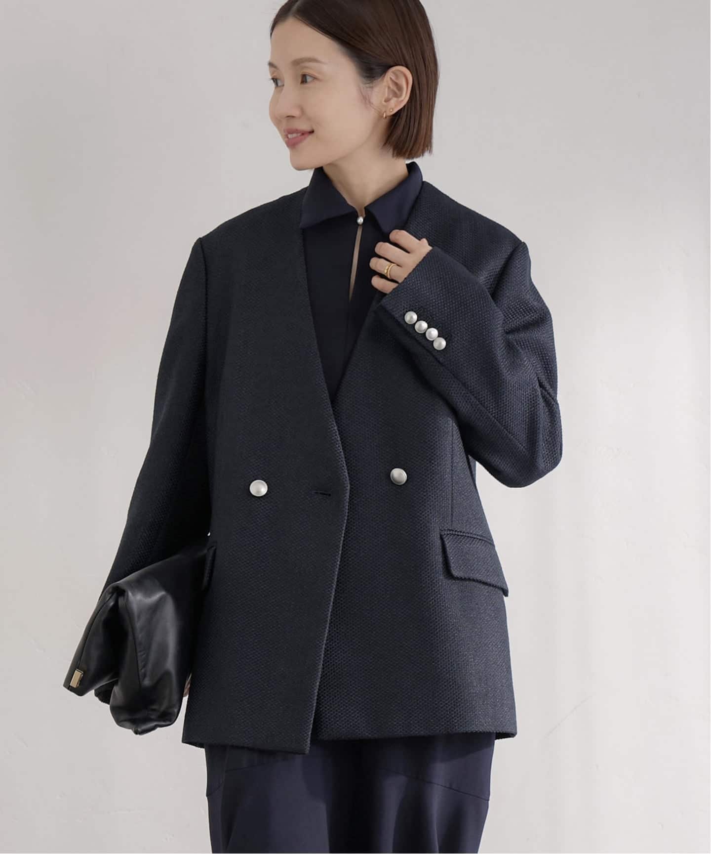 密に織られた表情豊かな素材と、シャープさと柔らかさを併せ持つノーカラーデザインが魅力です。