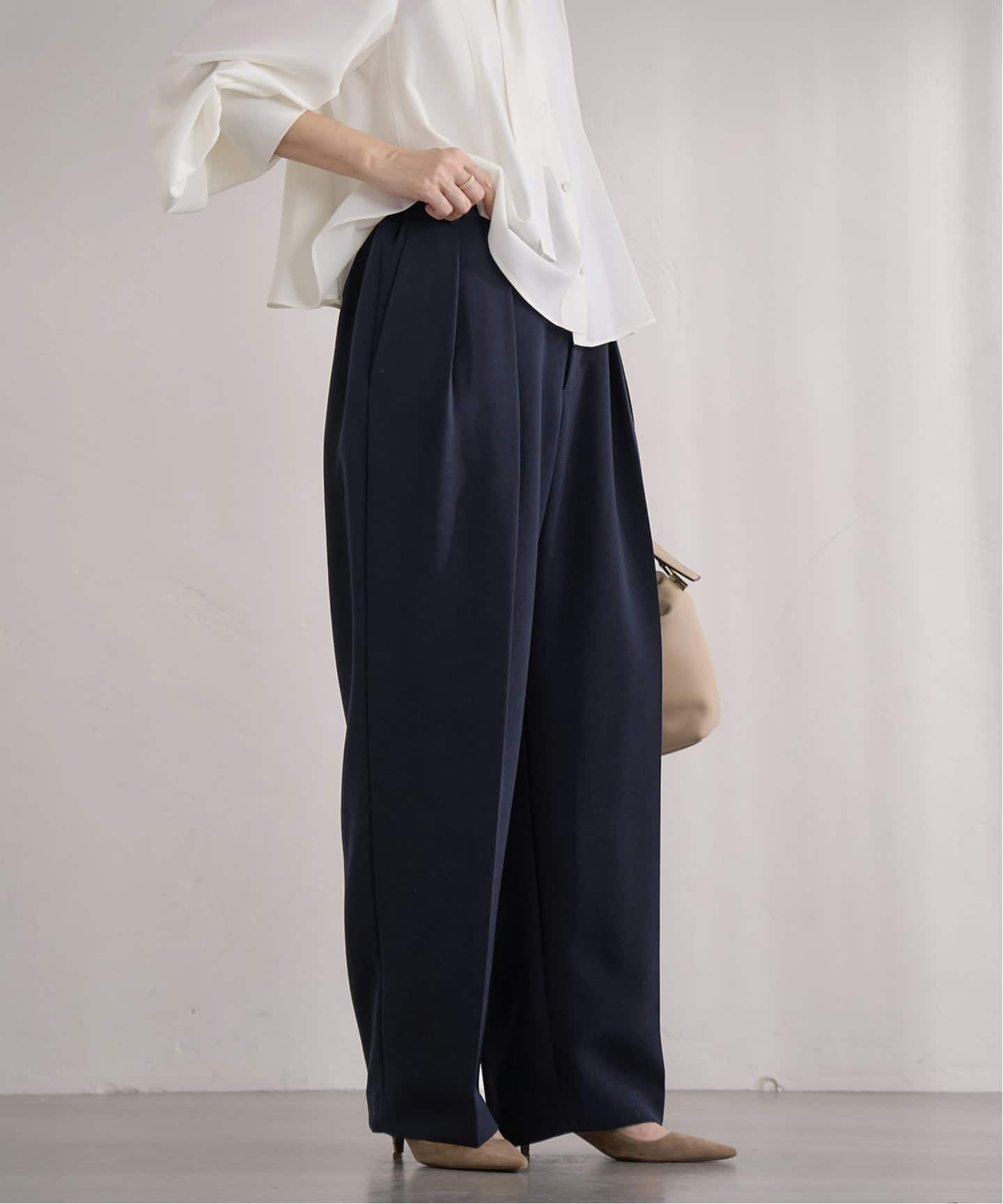 08.&NAVY 撥水ジョーゼットサイドゴムタックパンツ