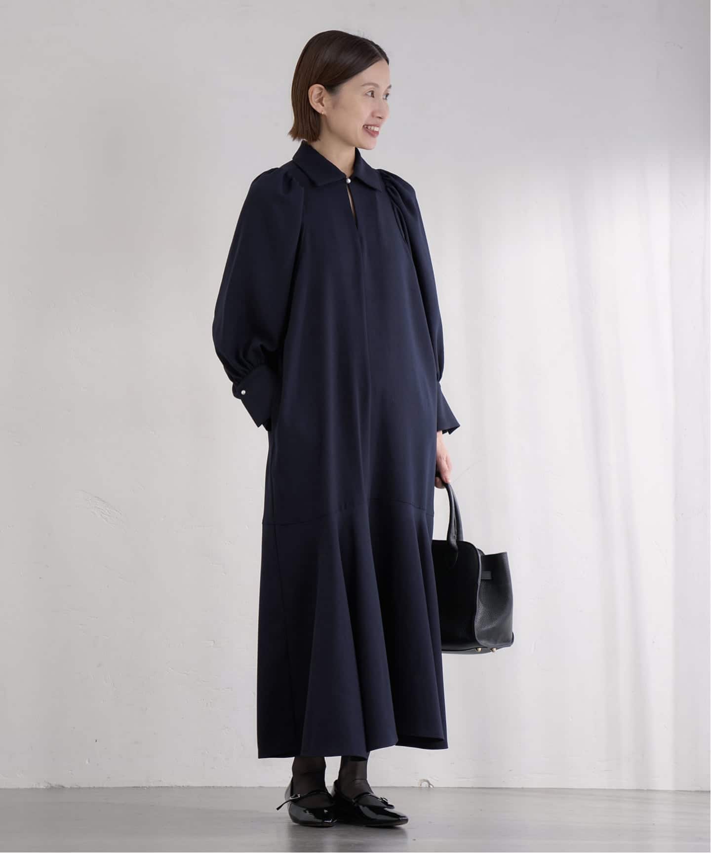 ほどよいハリと首元のダブルタックが立体感と華やかさを演出します。