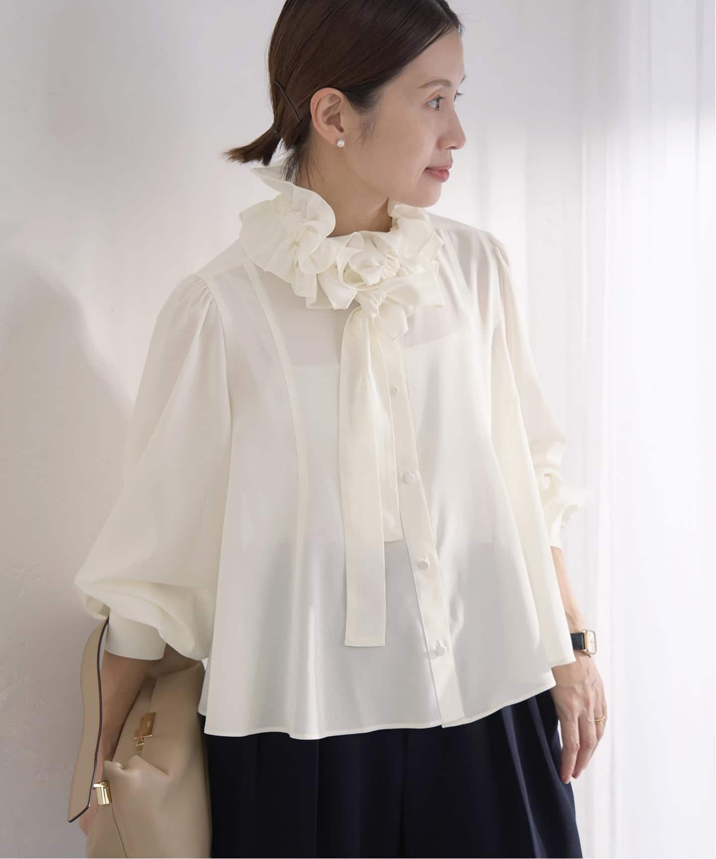 取り外し可能なギャザーボウタイが華やかさを添え、オフィシャルシーンやハレの日にも活躍します。