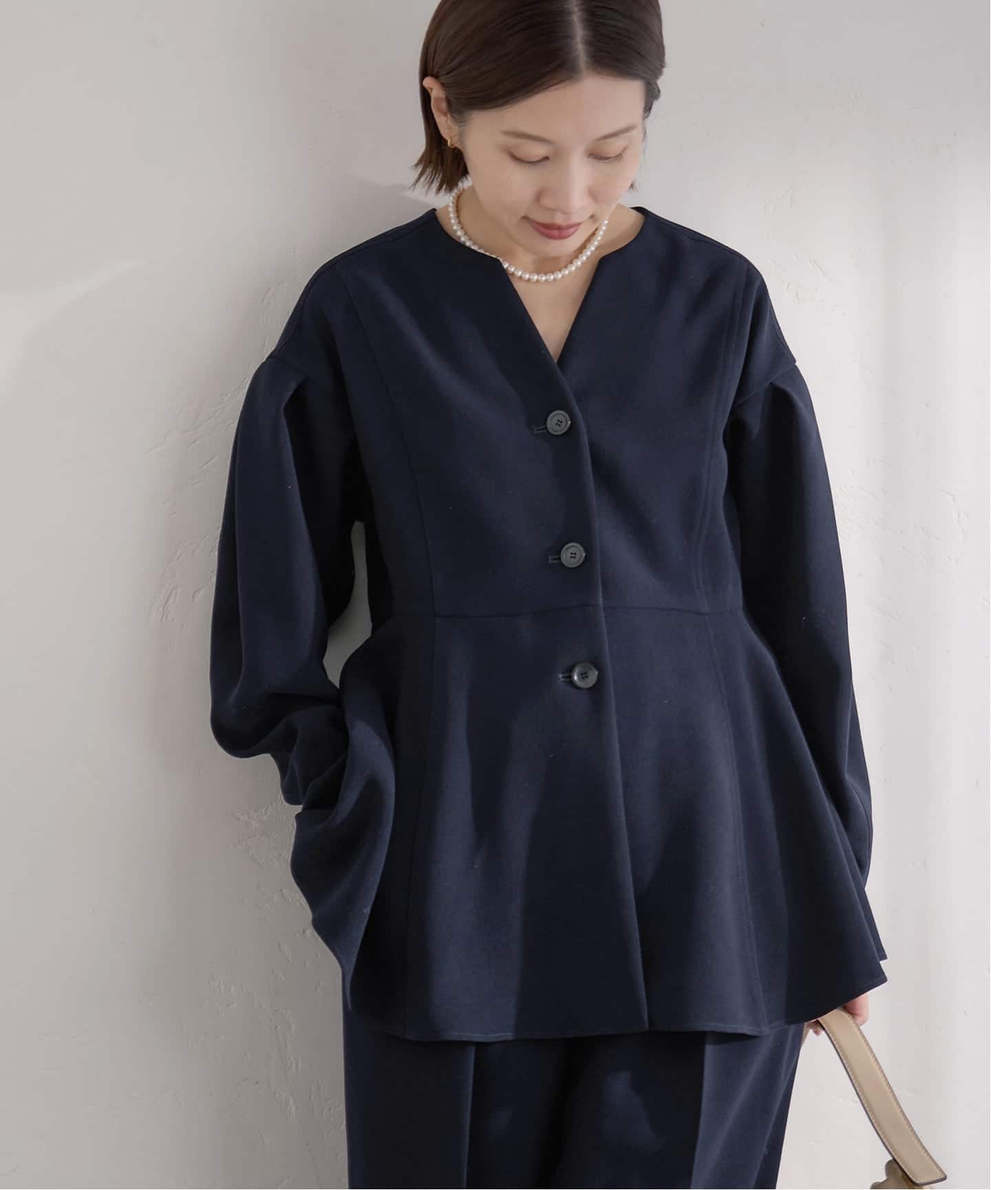 ペプラムデザインで華やかさときちんと感を両立し、セットアップでも単品でも幅広く活躍します。