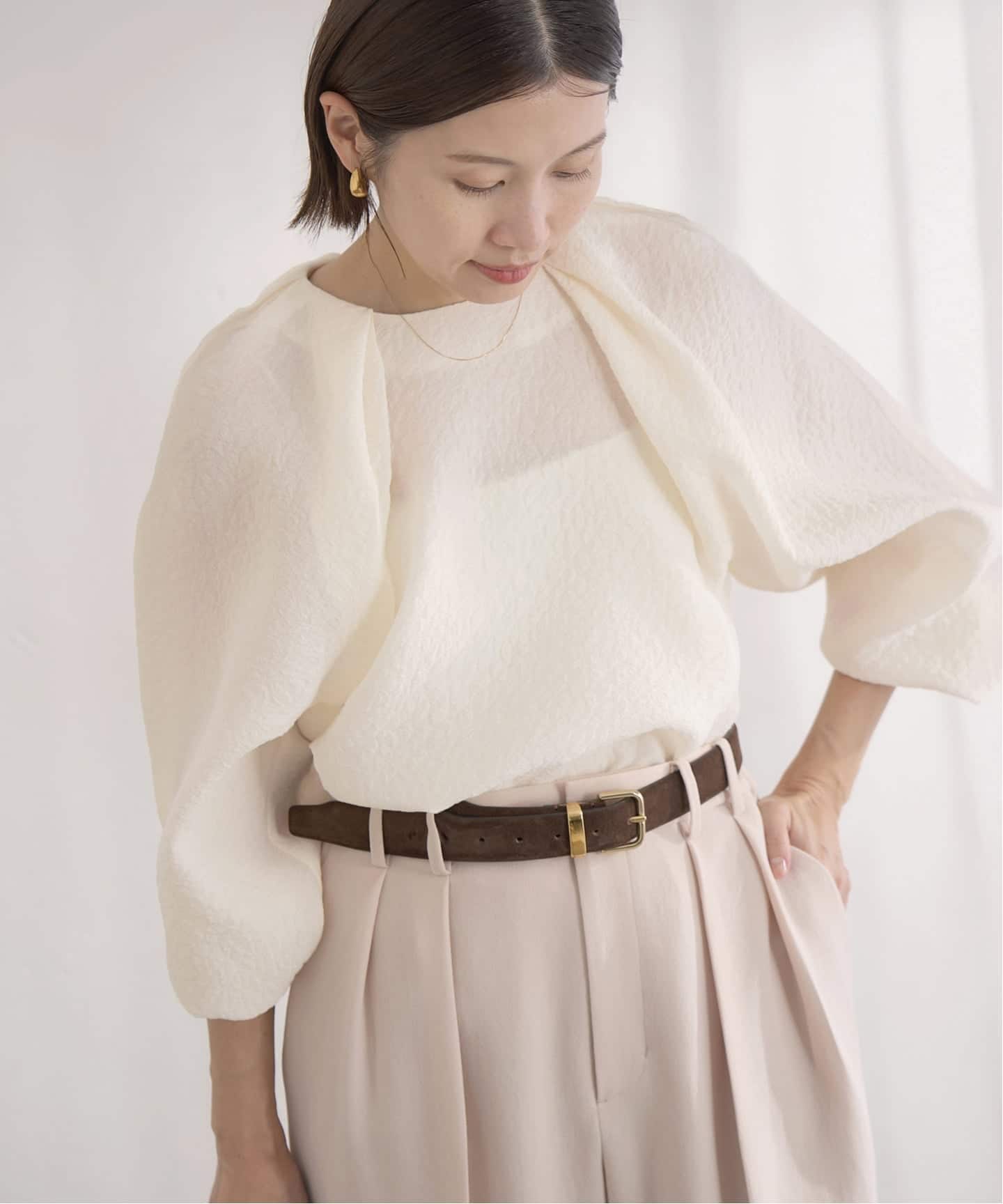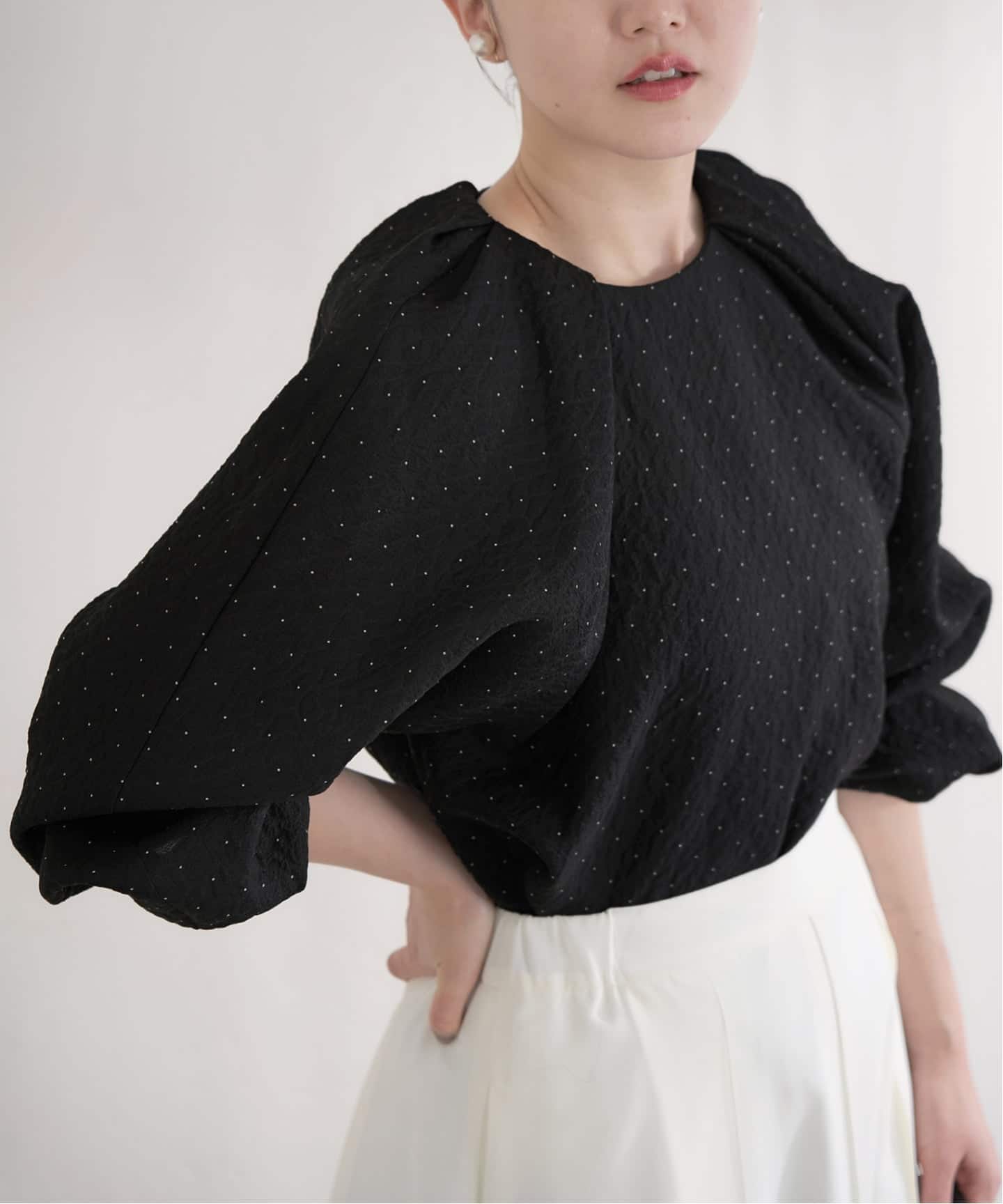 ジャカード機で繊細な凹凸を表現した、軽やかなオーガンジーブラウス。