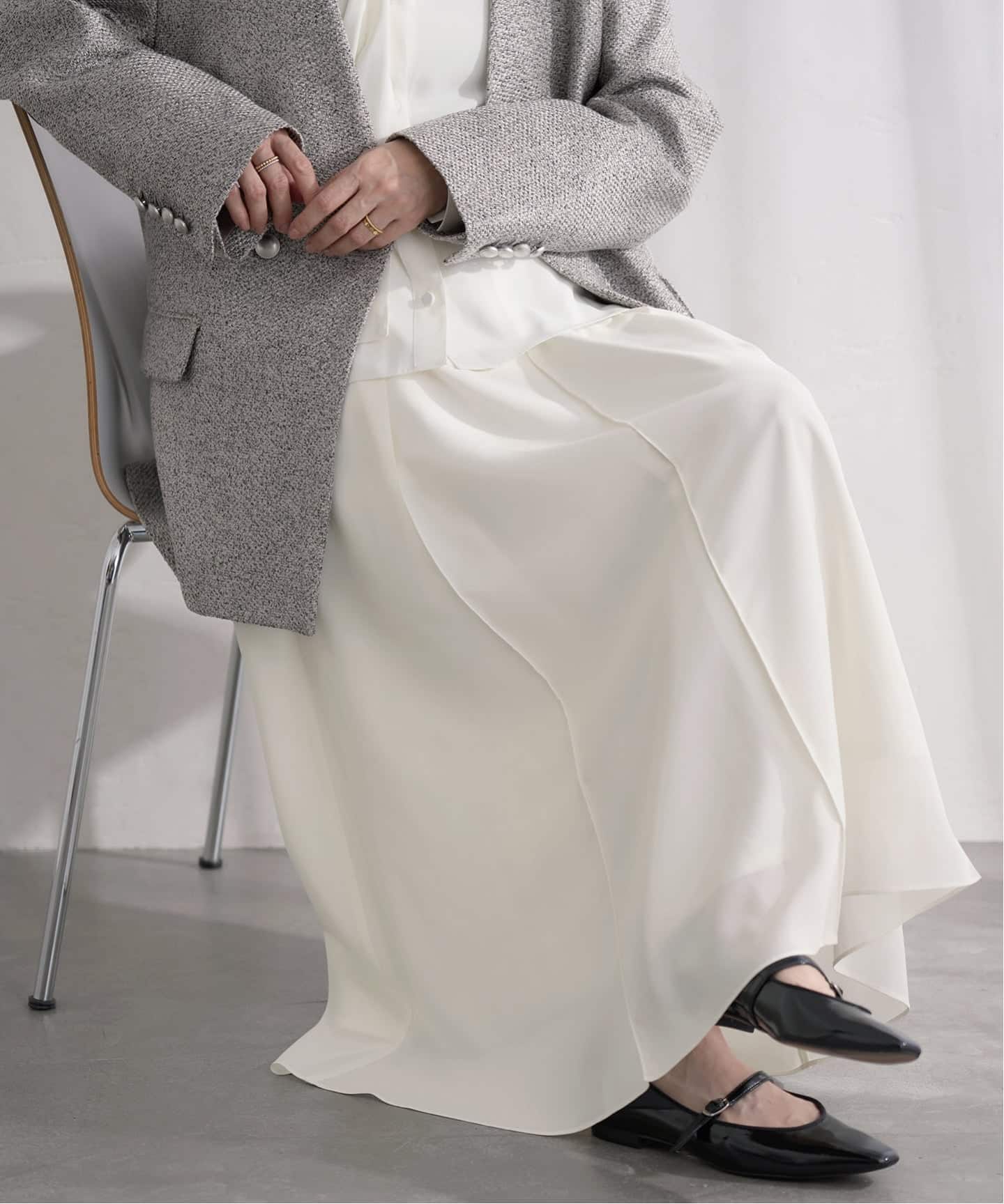 インナー次第で表情が変わり、シーズンレスに活躍するレイヤードアイテム。