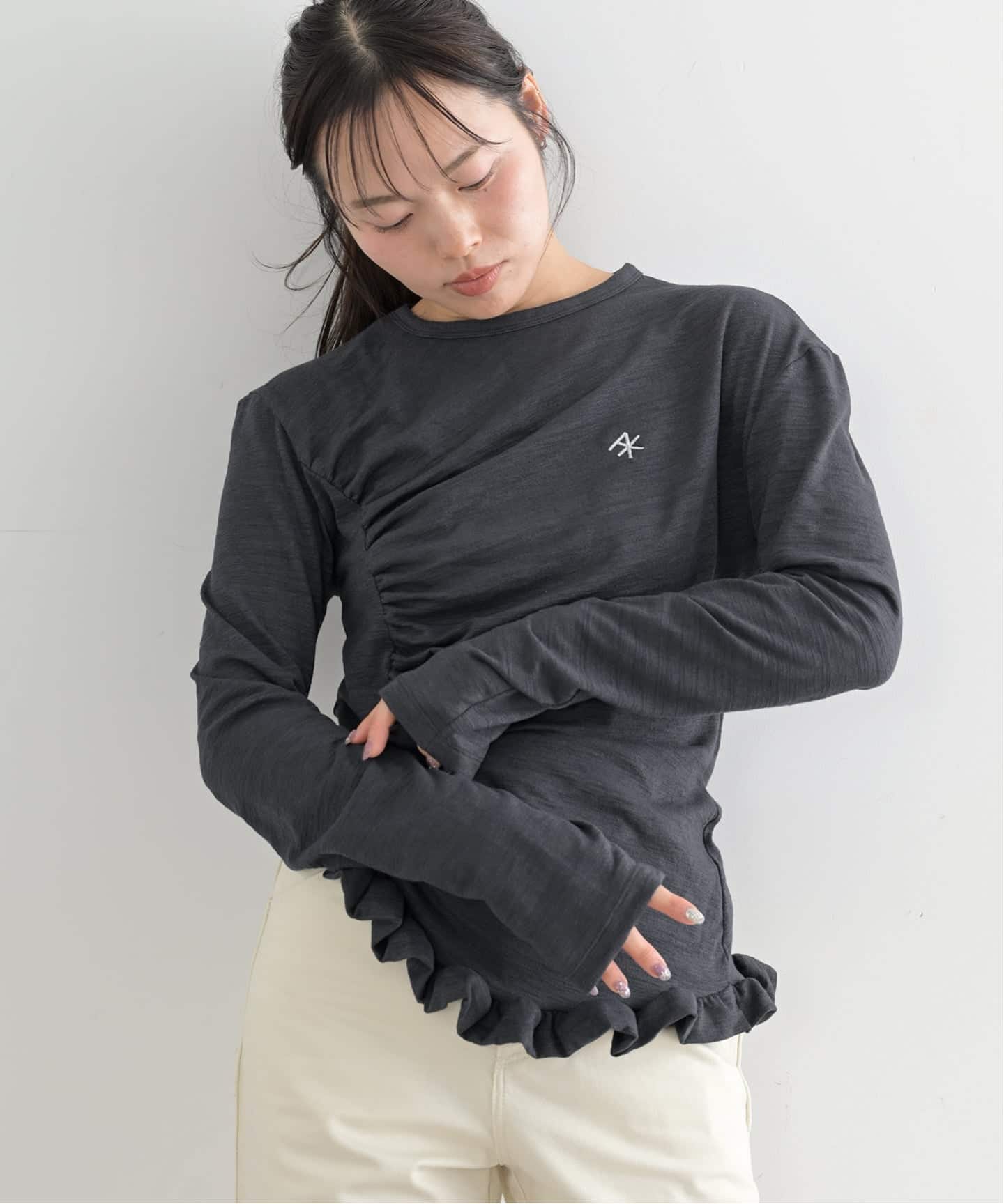 シャーリングにより立体的なシルエットで、ボディラインを拾いすぎずバランスの取りやすい1枚◎