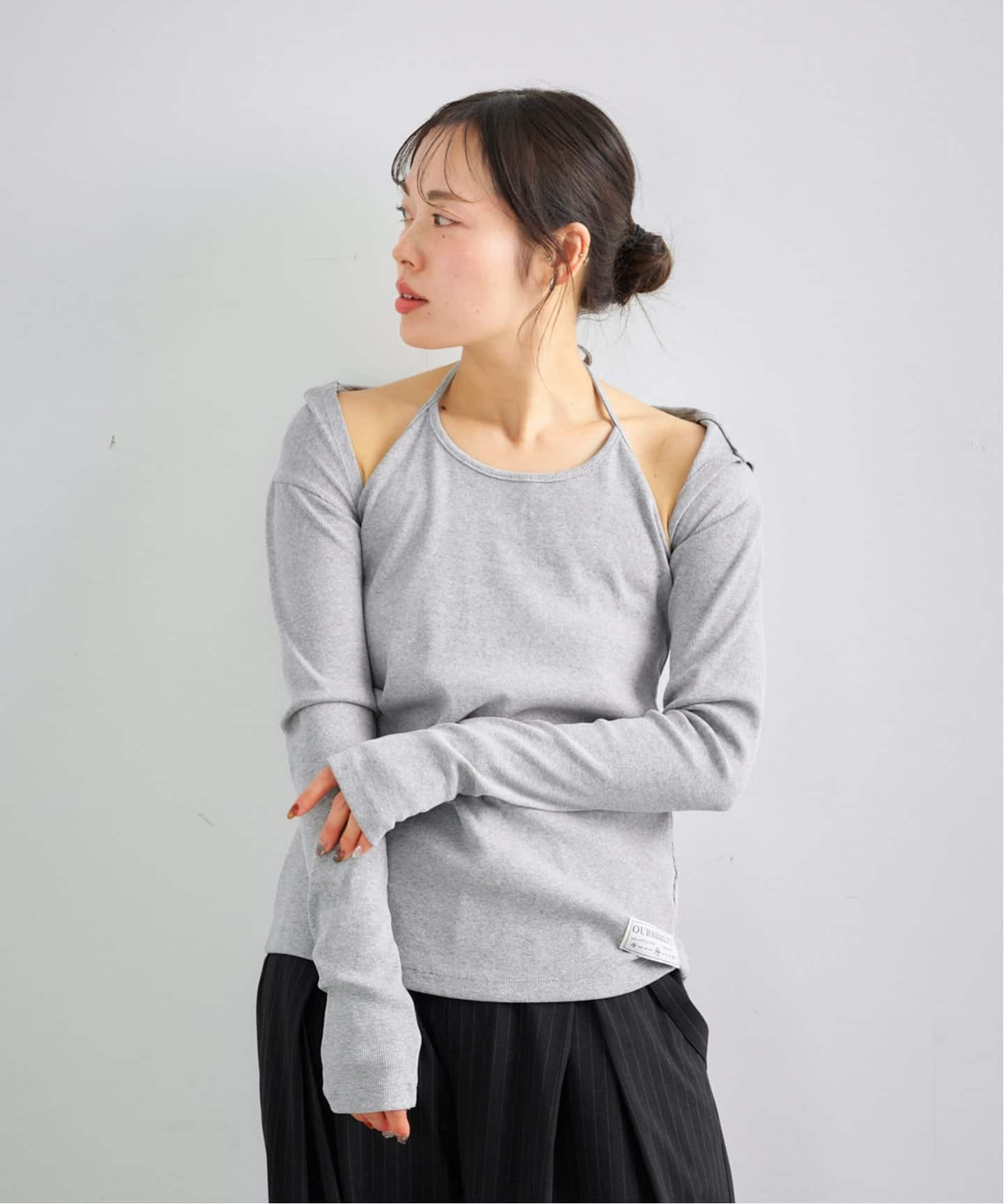 前後どちらでも着用可能な2WAY仕様、1枚でヘルシーに着こなすのはもちろん、トップスなどにレイヤードするのもおすすめ◎